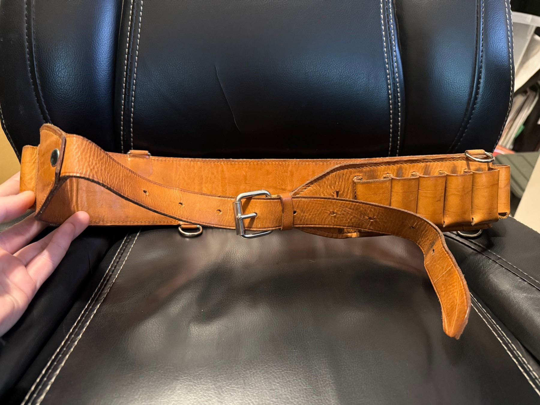 Pre-owned with normal wear, but overall in good, solid condition. Leather is soft and intact with no major damage. Buckle and loops are functional.