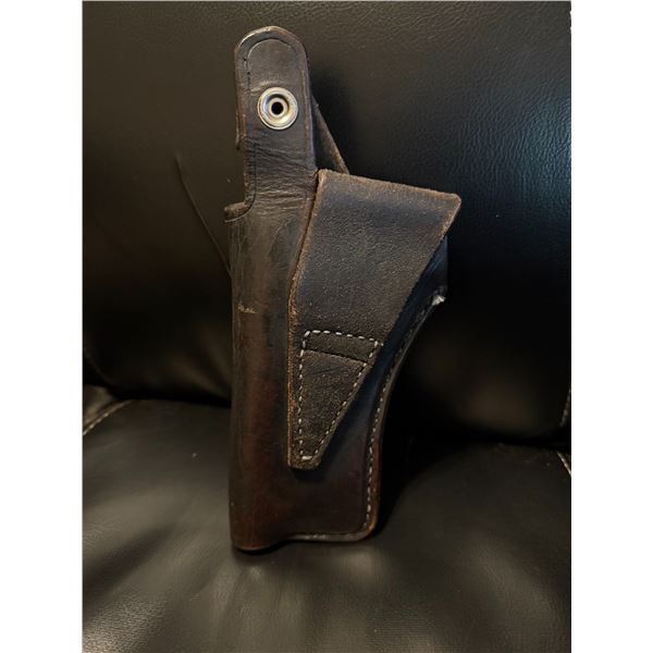 Small, classic dark leather unmarked pistol holster in good used condition. This piece features thick, durable leather construction with solid stitching throughout, offering a secure and reliable carry option for a variety of medium-frame pistols.