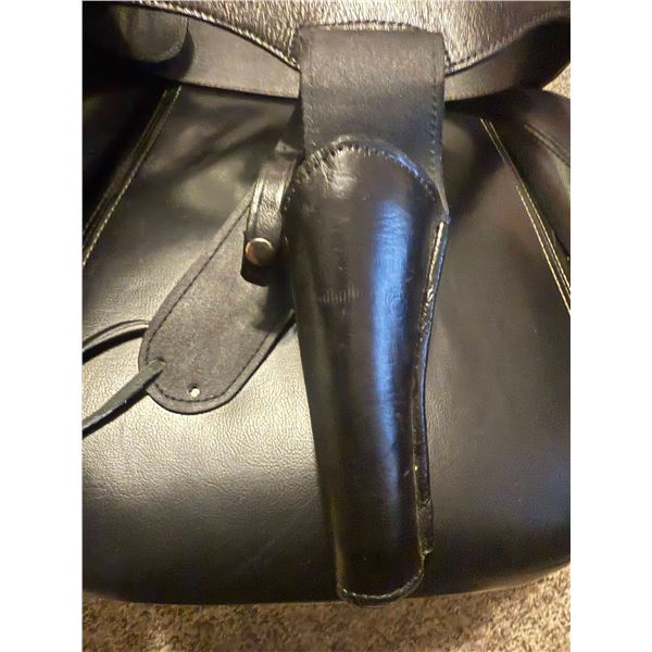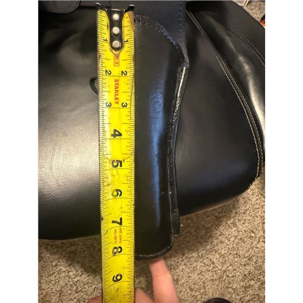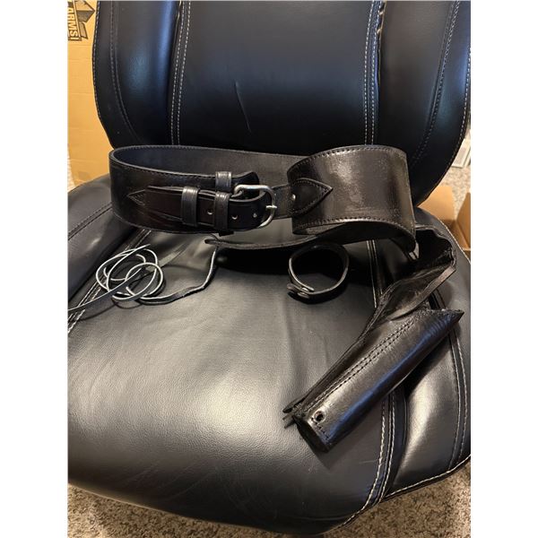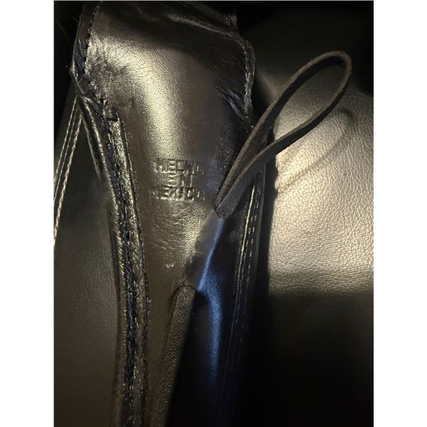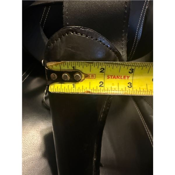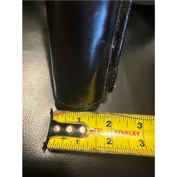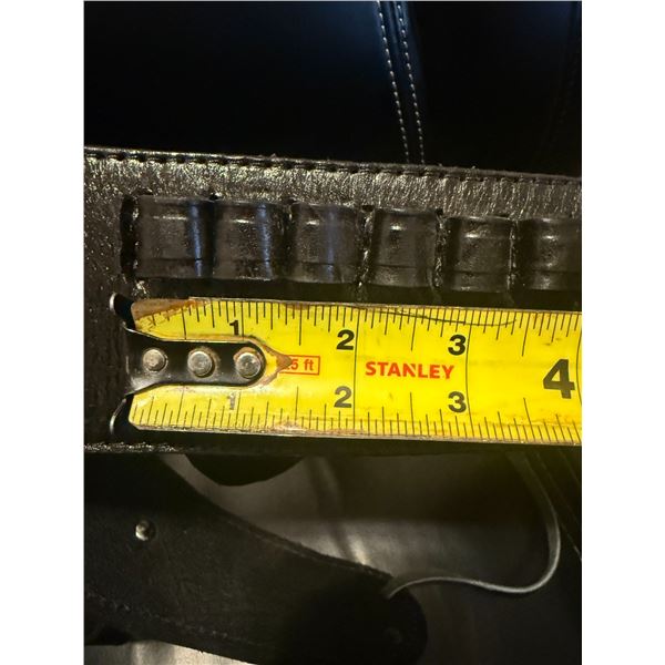 Holder is approx. 8” in height. Bottom width approx. 2”. Attached to a wide leather belt with 13 cartridge loops. The leather shows light wear from normal use, giving it a rugged, authentic look. No major damage noted. Everything included is shown in the photos.