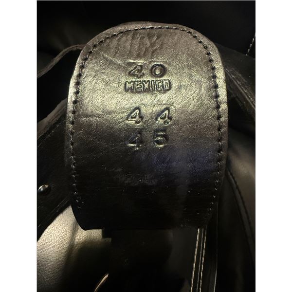 Well-made black leather magazine holster, stamped made in Mexico, and designed for practical field use or range carry. This piece is crafted from durable leather with reinforced stitching, offering both strength and longevity. Adjustable belt fit.