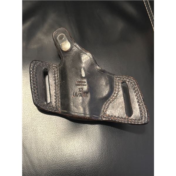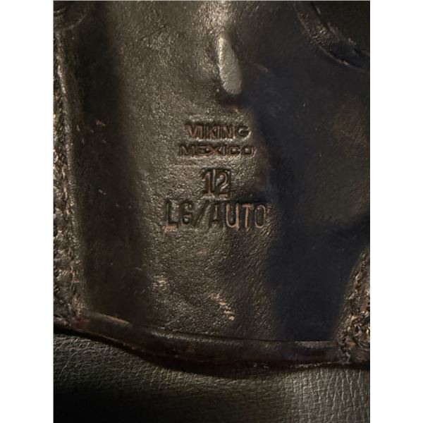 Viking brand leather outside-the-waistband (OWB) holster, stamped Model 12 – LG/AUTO, made in Mexico. This is a molded leather holster designed to fit many large-frame semi-automatic pistols. Features dual belt slots for secure carry and a thumb-break retention strap for added security. Contoured shaping for improved retention.