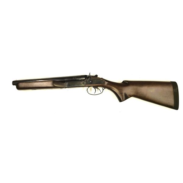 Takes 3 inch shells two short 12 inch barrels with break action. Exposed hammers.