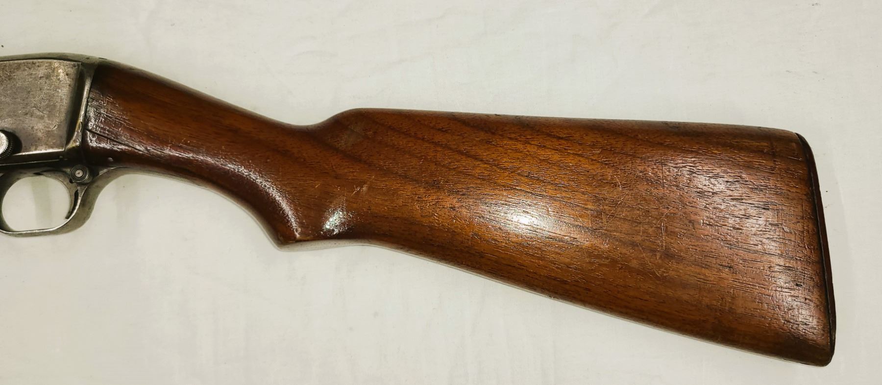 The stocks are two-piece walnut with round grooved slide handle, smooth semi-pistol