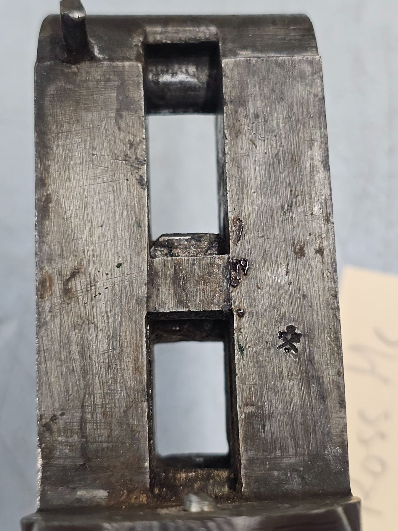 Butt is wood stock with no cover plate - has hatching carved into wood.