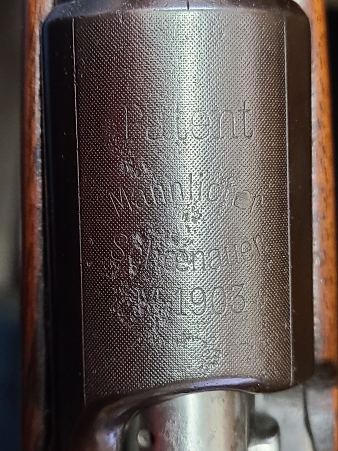 Has the words Patent Mannlicher Schoenauer M1903 stamped ontop of receiver.
