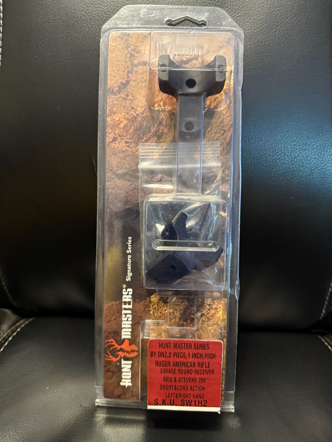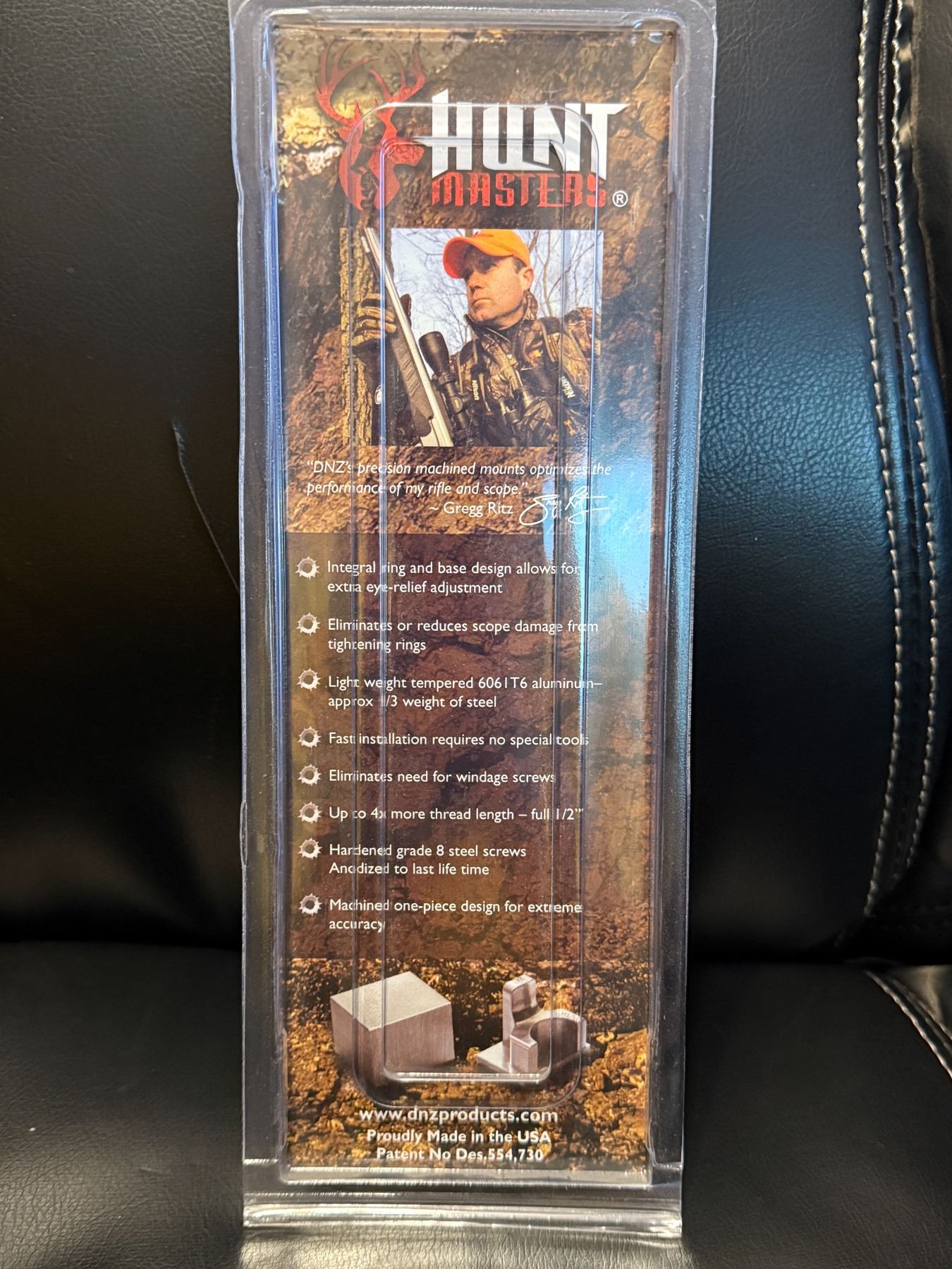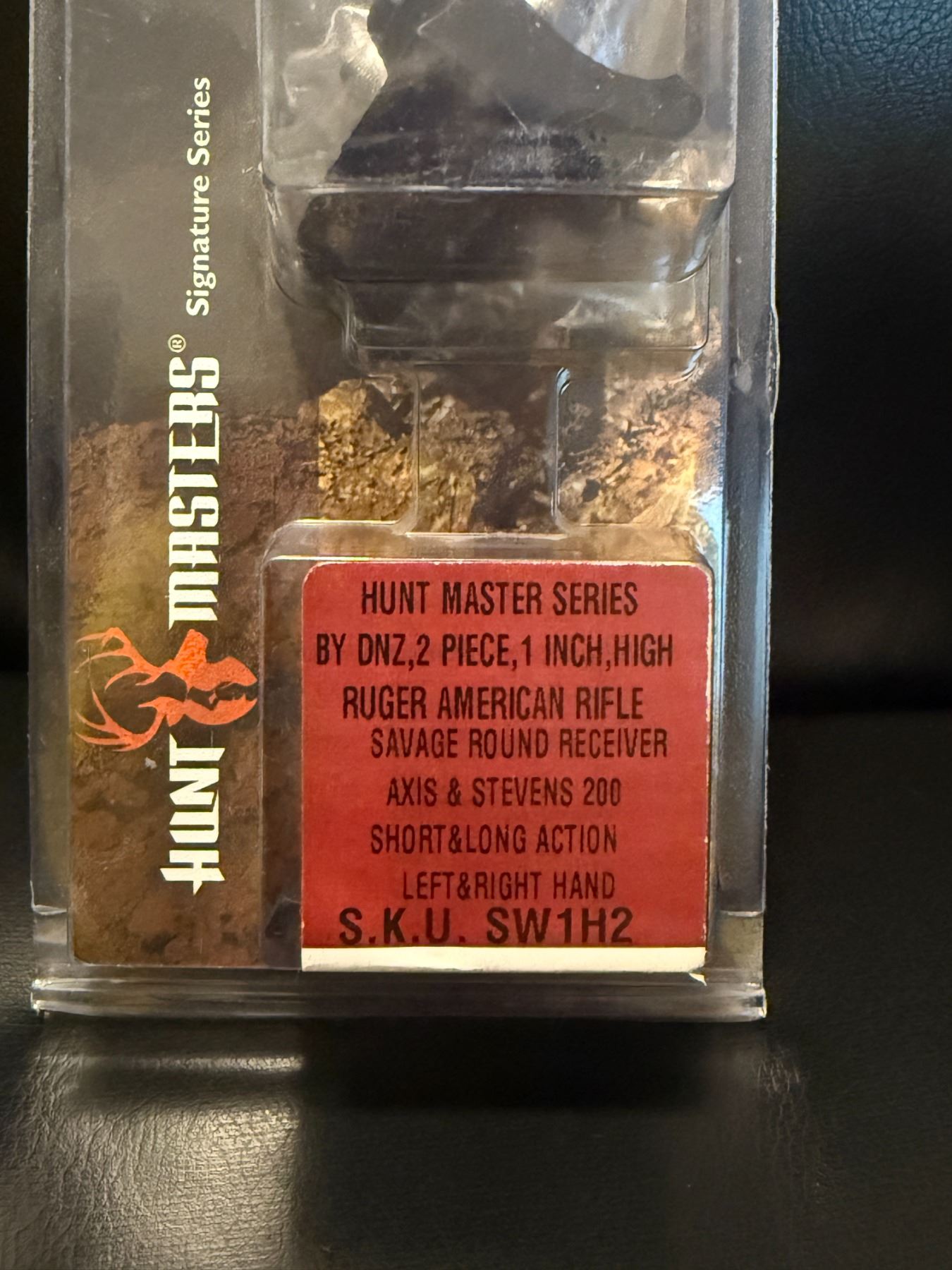 Hunt Masters Series scope mount by DNZ Products, still sealed in original packaging. This is a 2-piece, 1-inch, high-height mount designed for dependable, rock-solid scope installation on popular bolt-action rifles. SKU: SW1H2