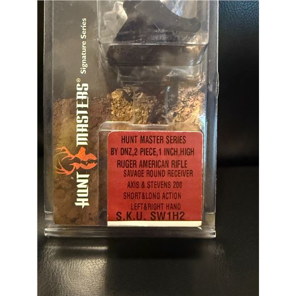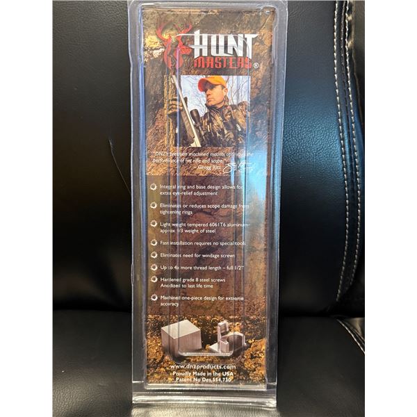 Hunt Masters Series scope mount by DNZ Products, still sealed in original packaging. This is a 2-piece, 1-inch, high-height mount designed for dependable, rock-solid scope installation on popular bolt-action rifles. SKU: SW1H2