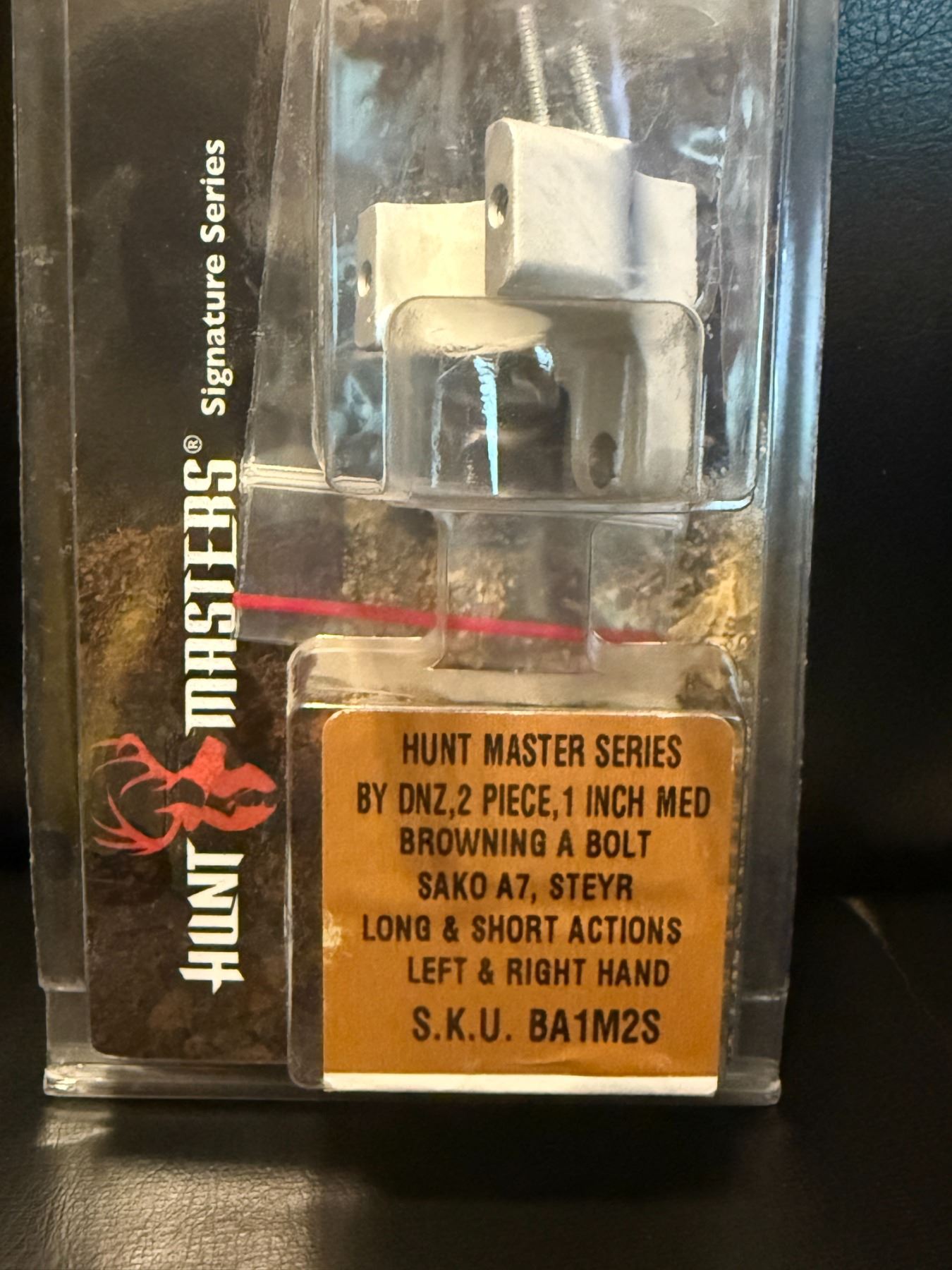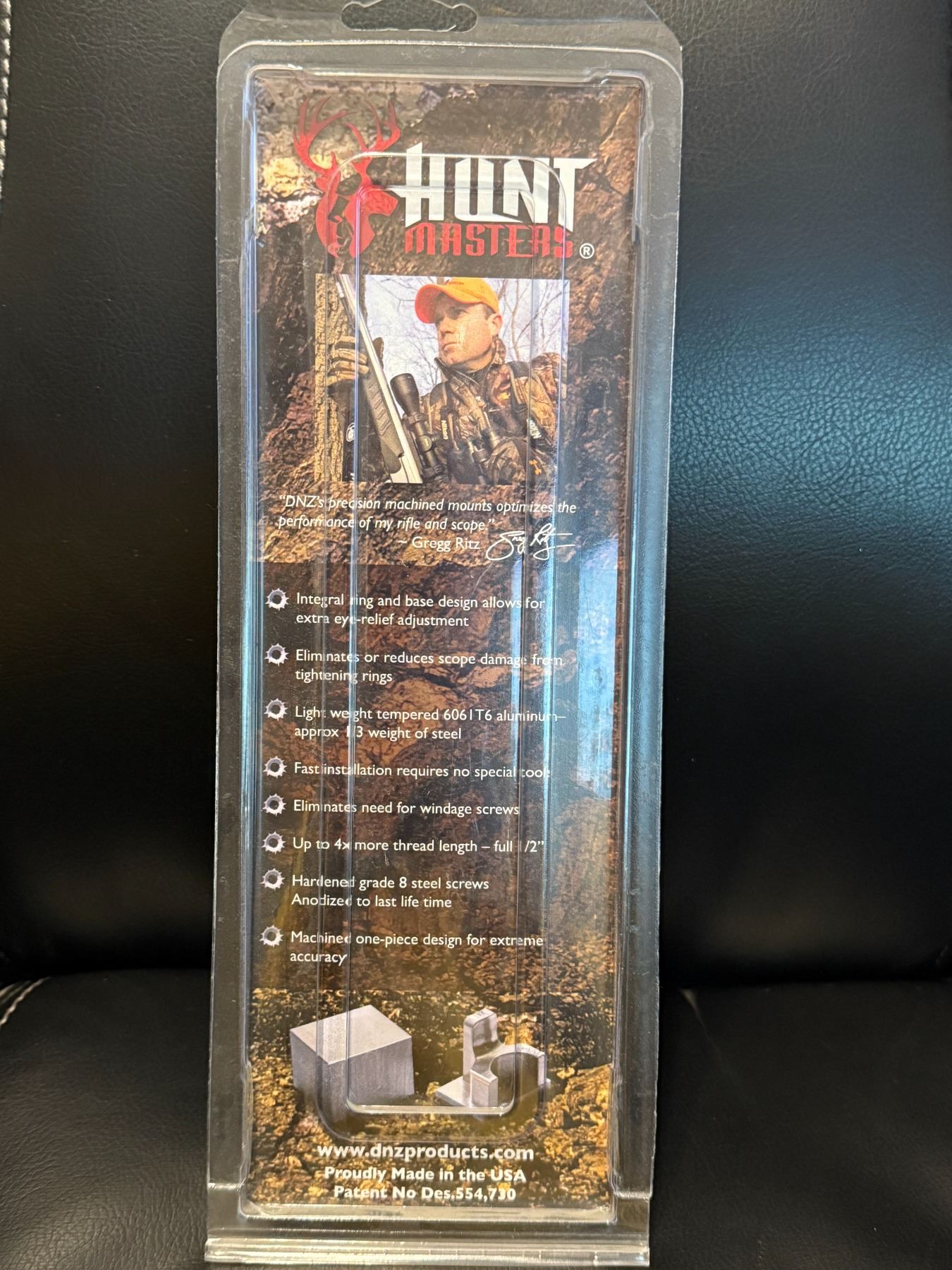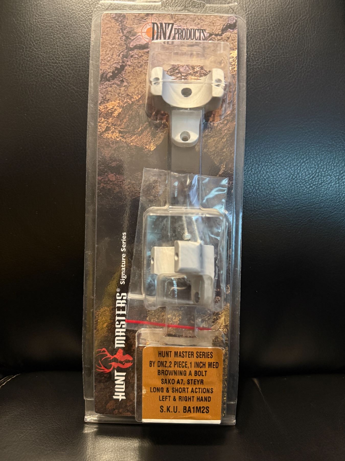Brand-new DNZ Hunt Master Series 2-piece scope mounting system, finished in silver anodized aluminum. This model is designed to fit several popular hunting rifles and is built for strength, reliability, and precision alignment.