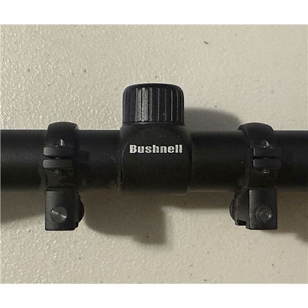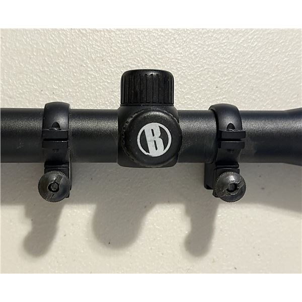 Modern Bushnell Banner-style riflescope in matte black finish. Features a variable zoom adjustment ring (numbered 3–9), clear optics, and included scope rings already mounted. Great for a hunting rifle or as an affordable upgrade for any centerfire or rimfire rifle.