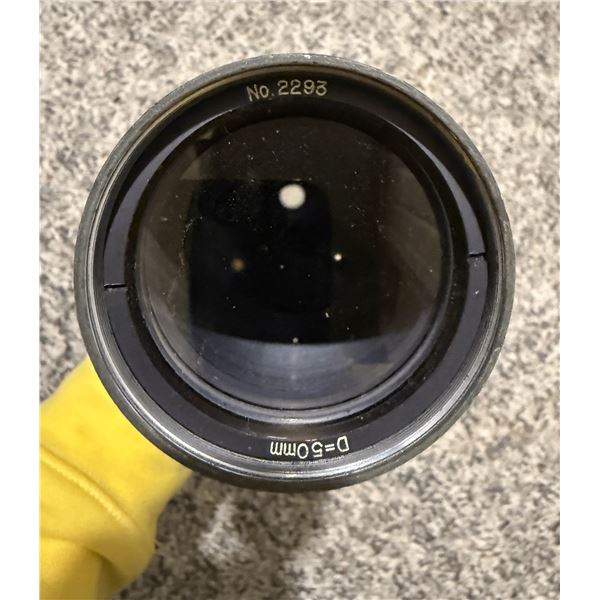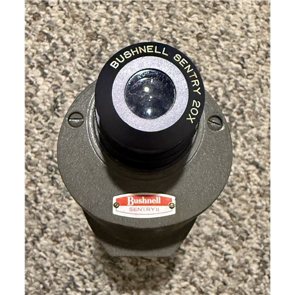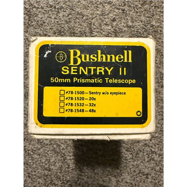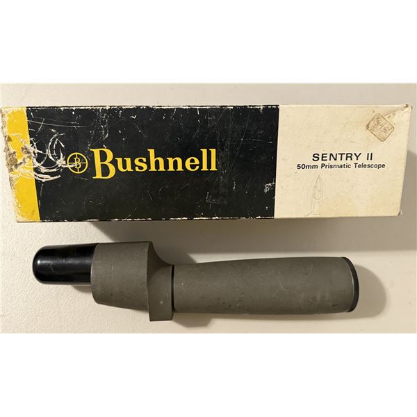 Bushnell Sentry II Spotting Scope, featuring the 20x eyepiece and the classic prismatic 50mm design. This unit is made in Japan and comes with its original Bushnell box (box shows wear and tear, as pictured). Serial No. 2293.