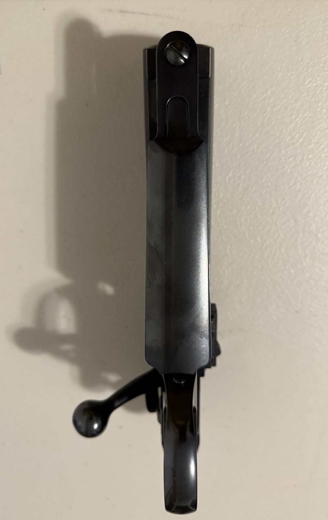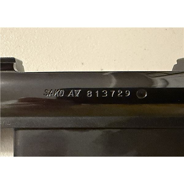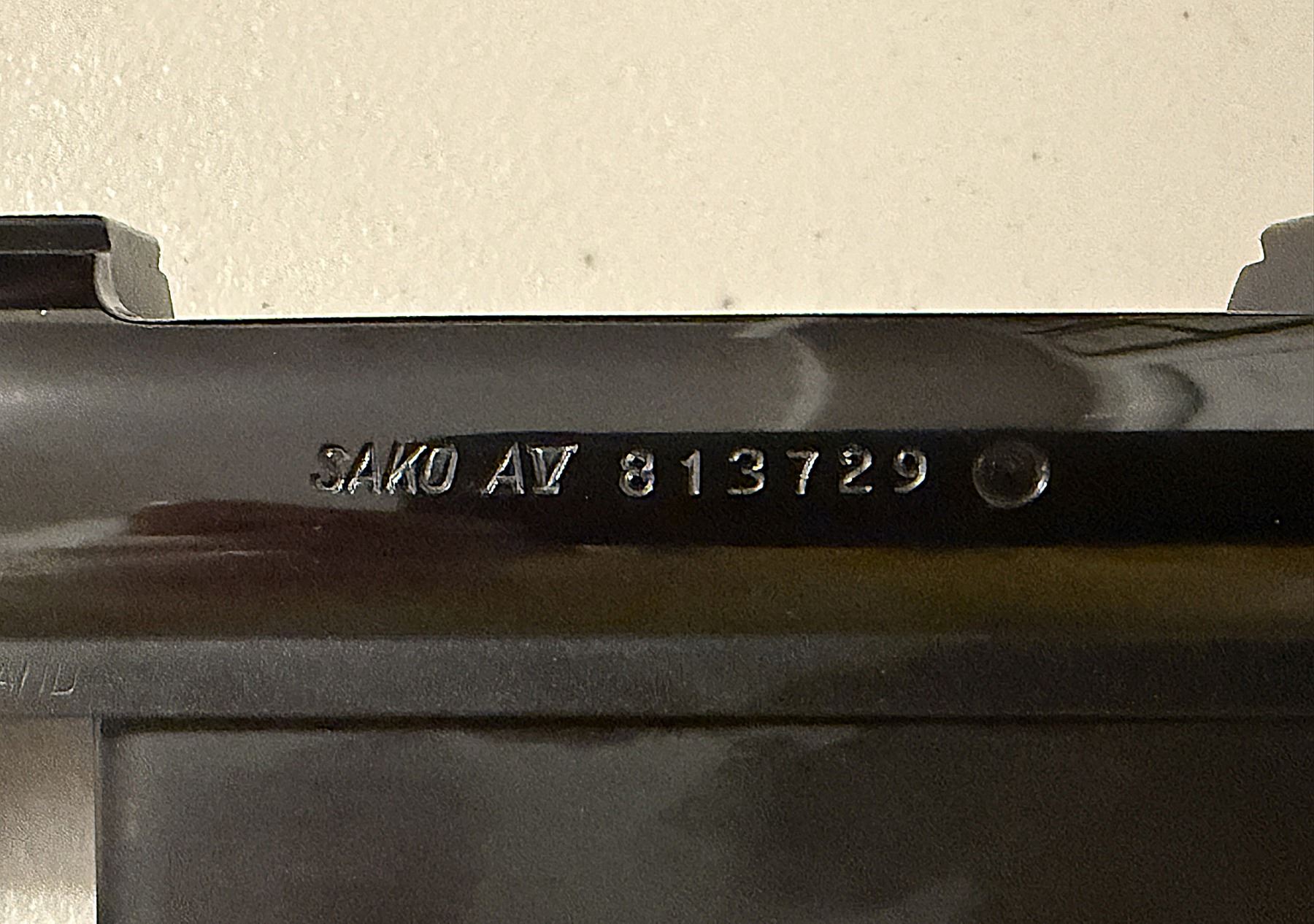 Beautiful condition SAKO AV long-action receiver assembly, complete with matching Sako AV bolt, factory trigger assembly, bottom metal & internal magazine, safety, bolt shroud & cocking piece. Marked “SAKO AV – Made in Finland”. Serial No. 813729. This action has a 30-06 sized bolt face.