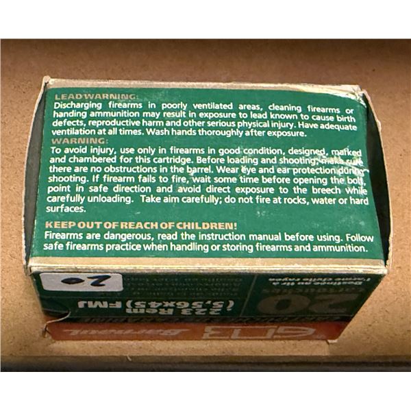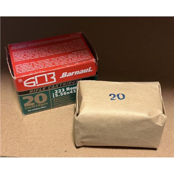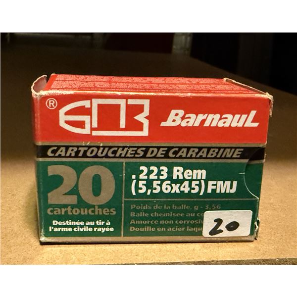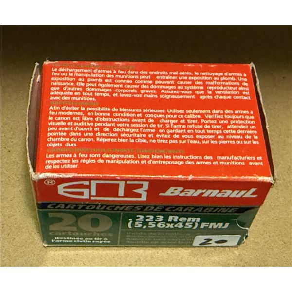 JSC Barnaul Cartridge Plant. Sealed box of 20 cartridges .223 Rem (5.56 x 45) FMJ. Bullet weight - 55gr. Full metal jacket boat tail. Non-corrosive. Lacquered steel case.