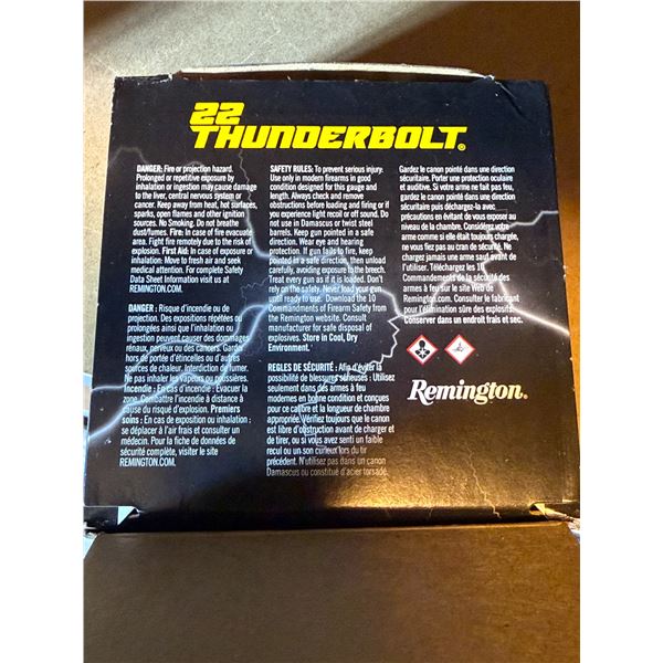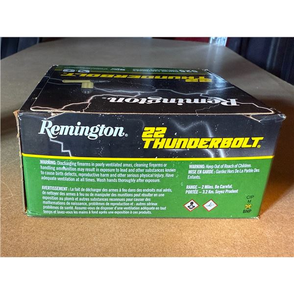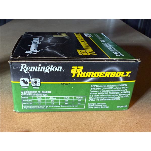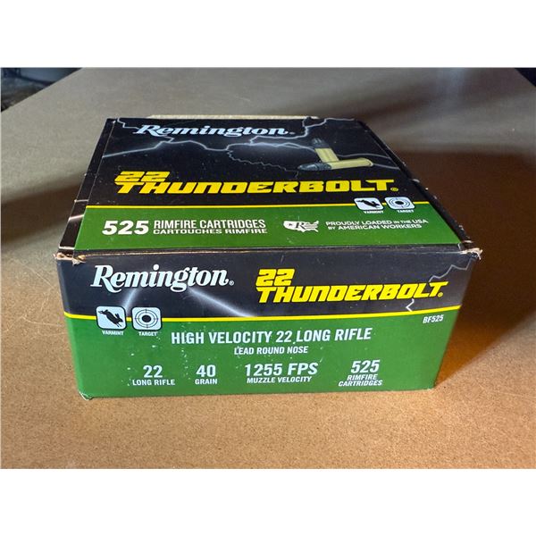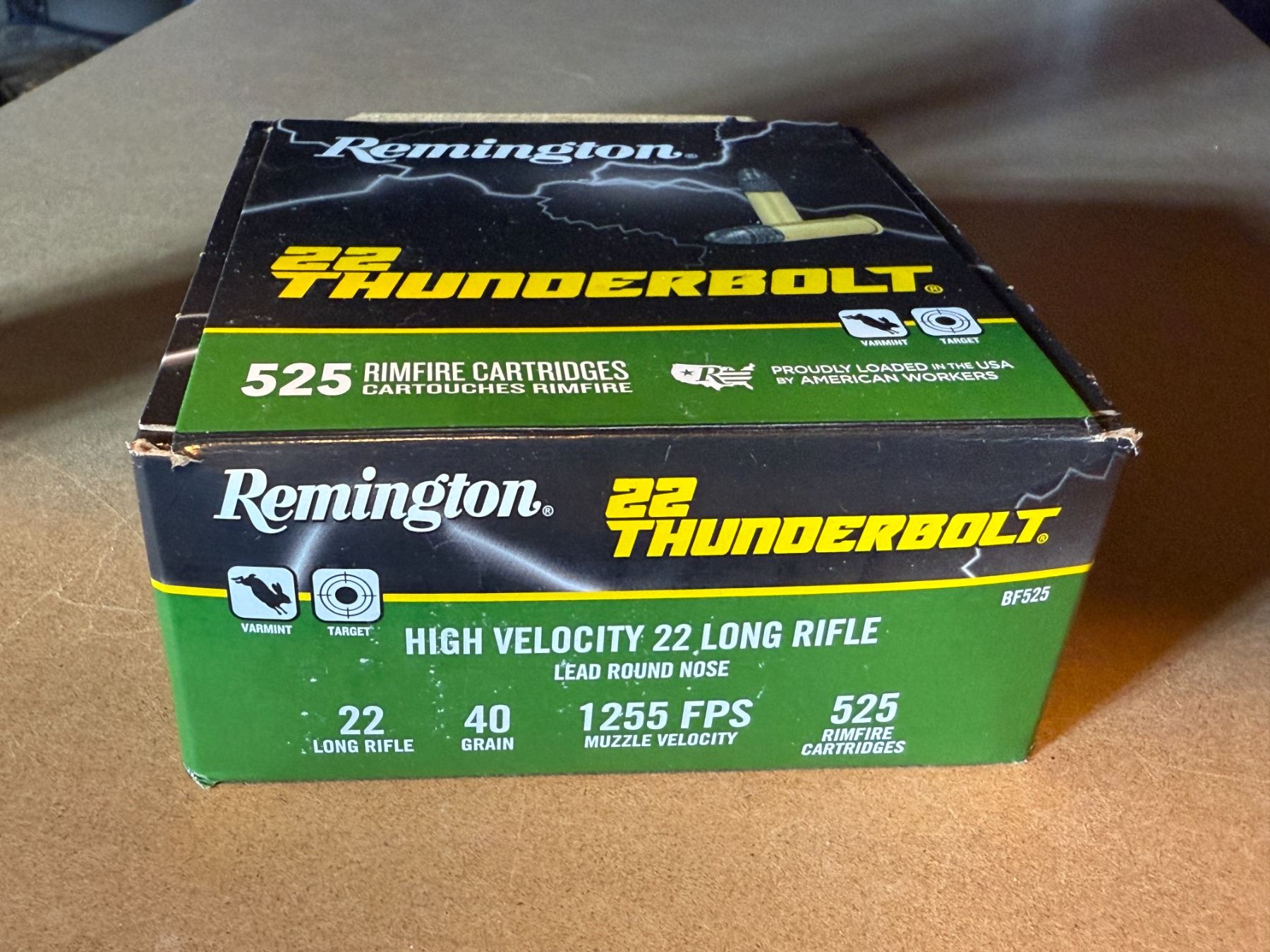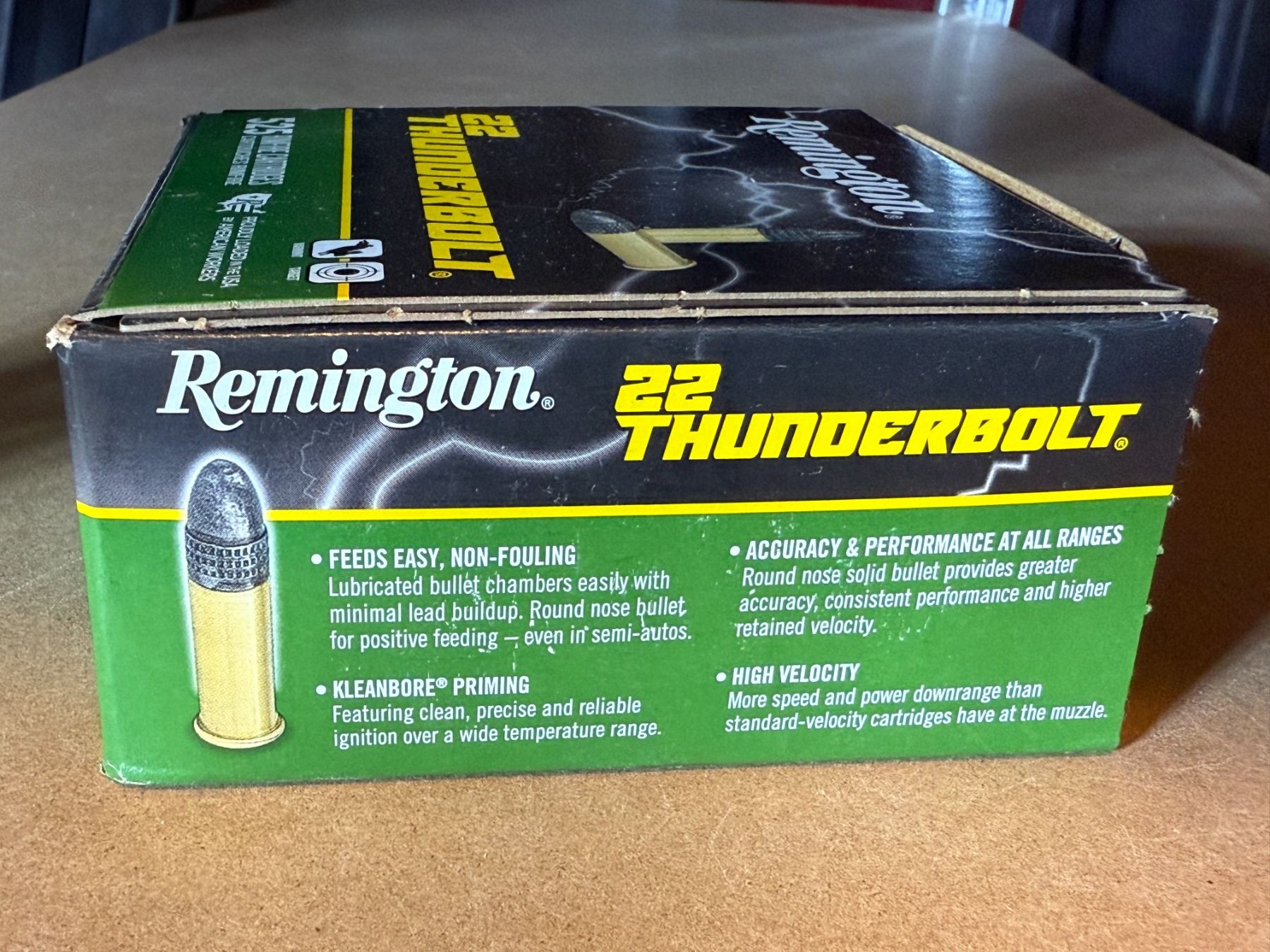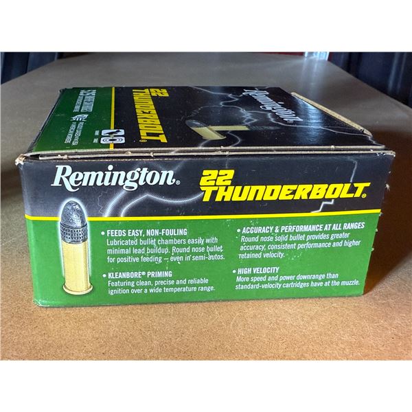 Box of Remington 22 Thunderbolt High Velocity 22 Long Rifle 525 Rimfire Cartridges. Lead round nose. 40 grain. 1255 FPS Muzzle Velocity.