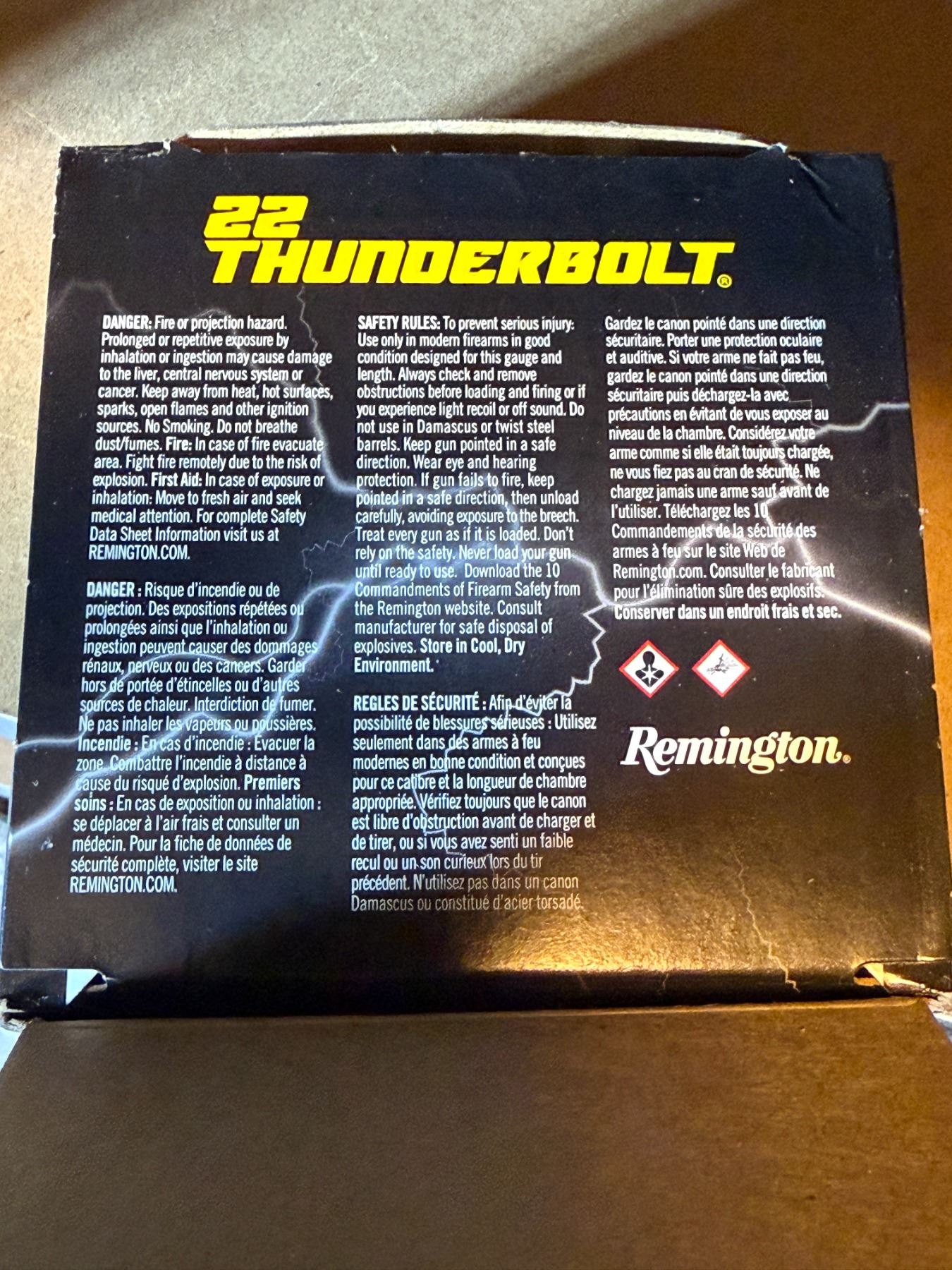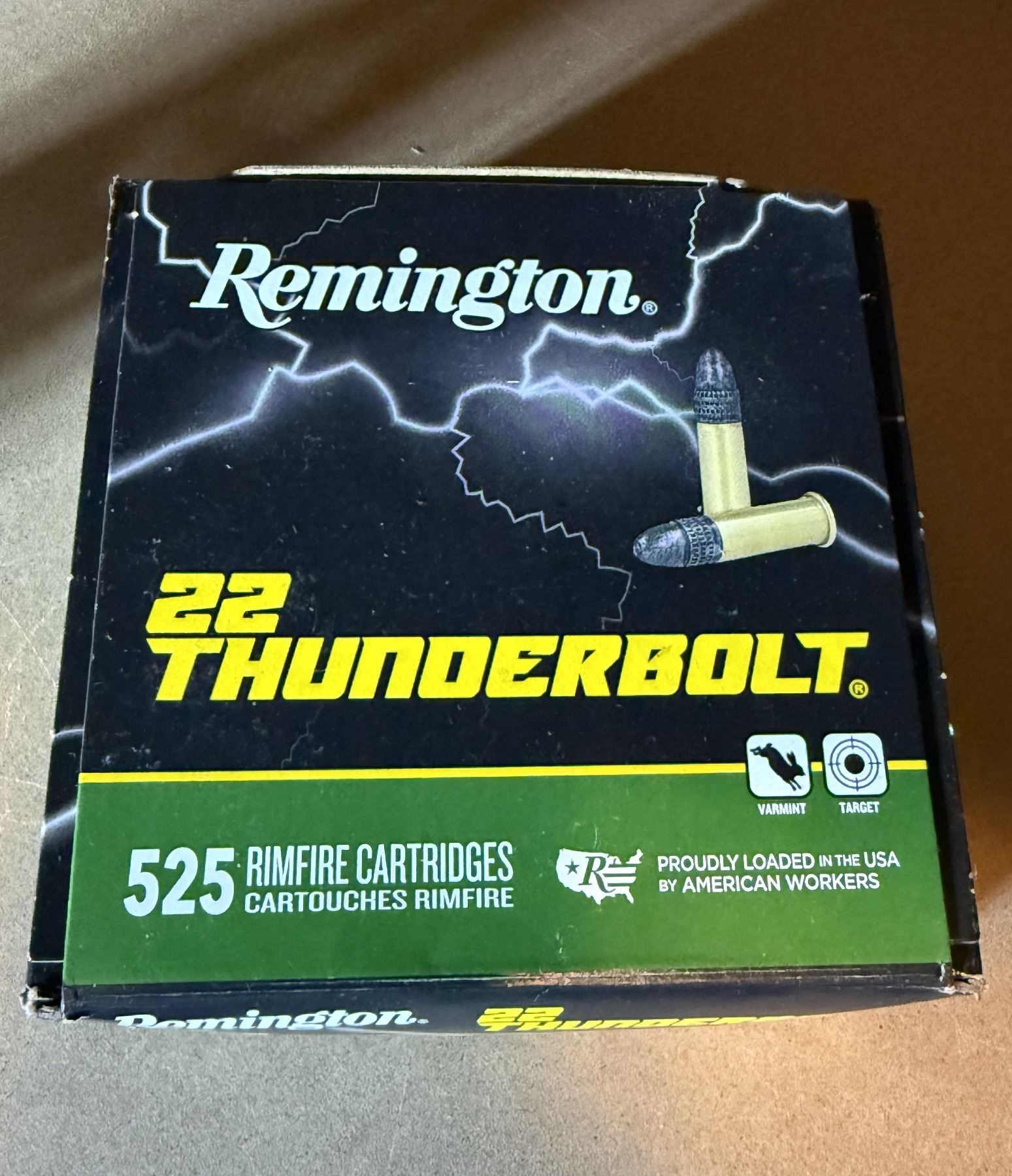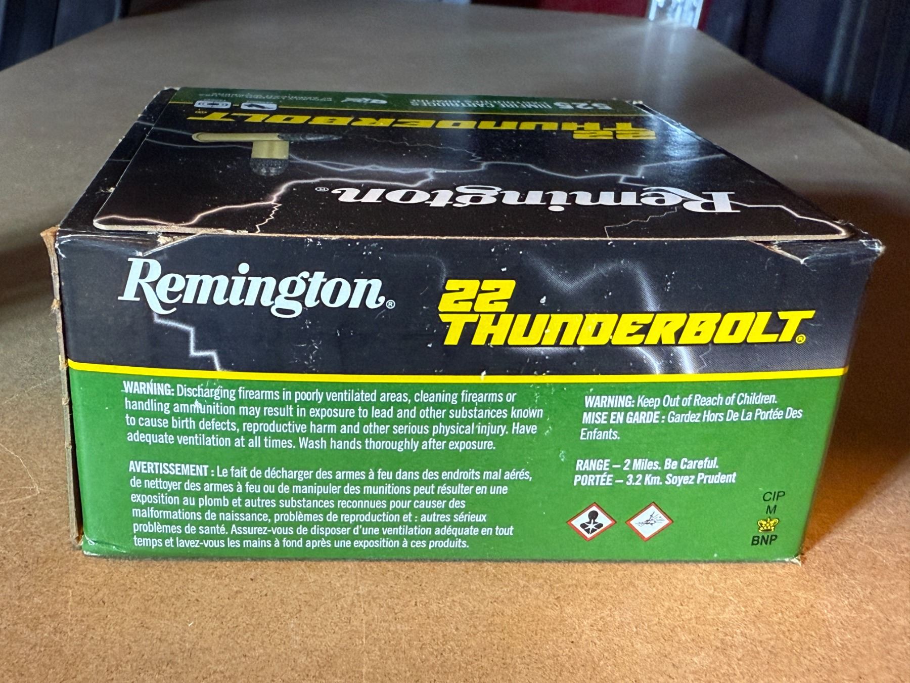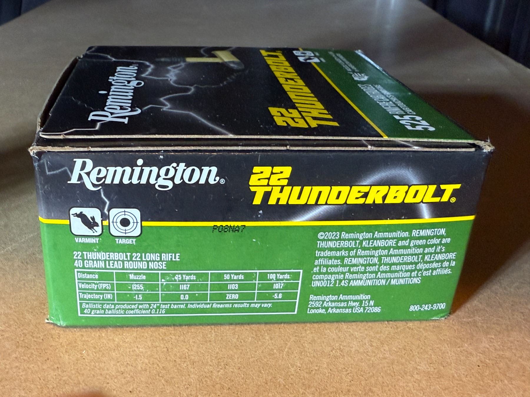 Box of Remington 22 Thunderbolt High Velocity 22 Long Rifle 525 Rimfire Cartridges. Lead round nose. 40 grain. 1255 FPS Muzzle Velocity.