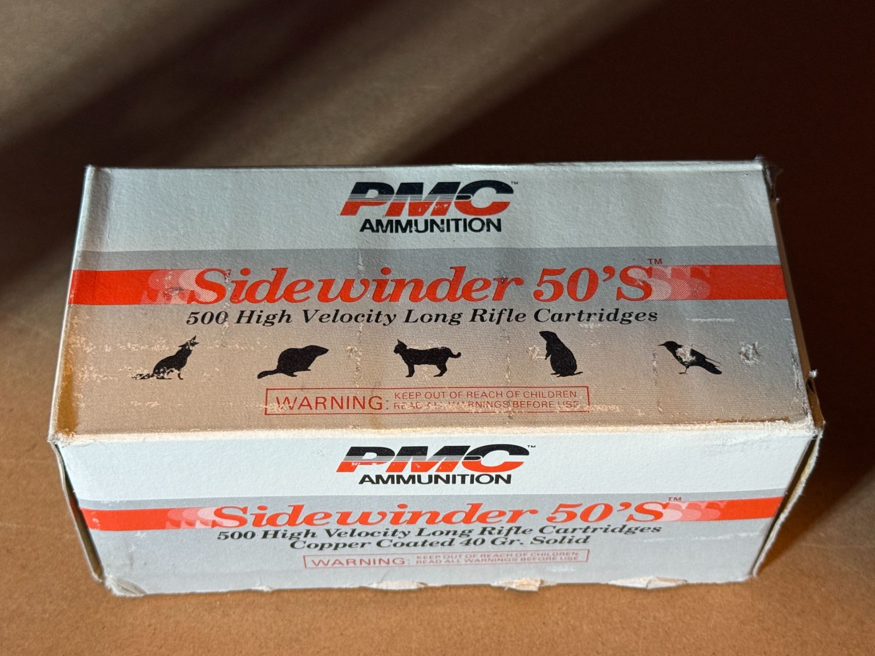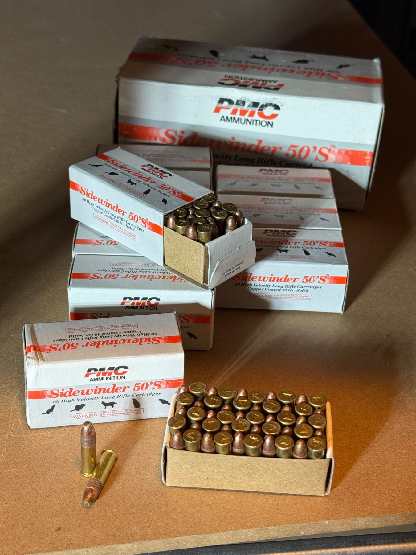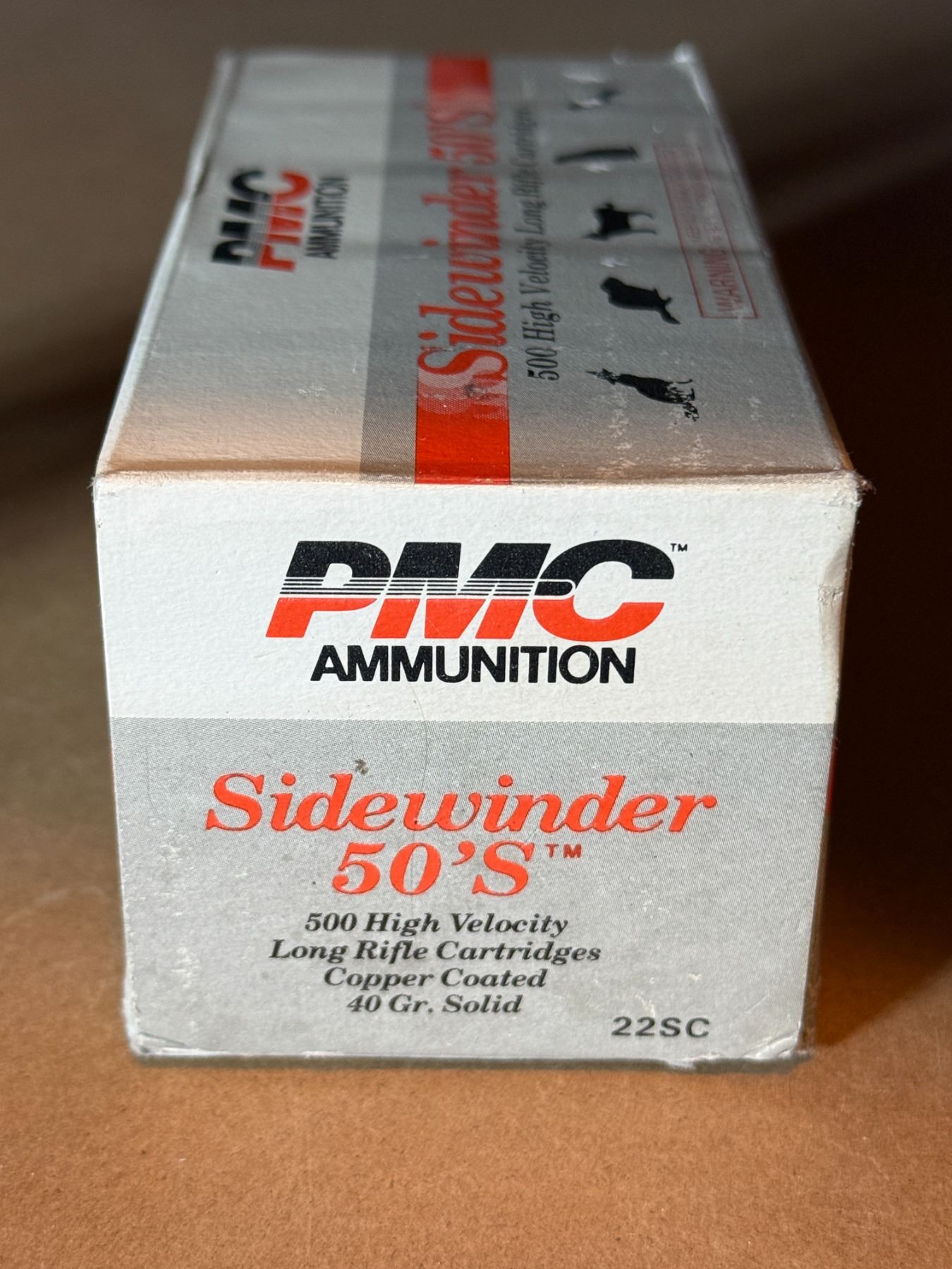 500 high velocity long rifle cartridges. Copper coated 40 gr. Solid. PMC ammunition Sidewinder 50'S.
