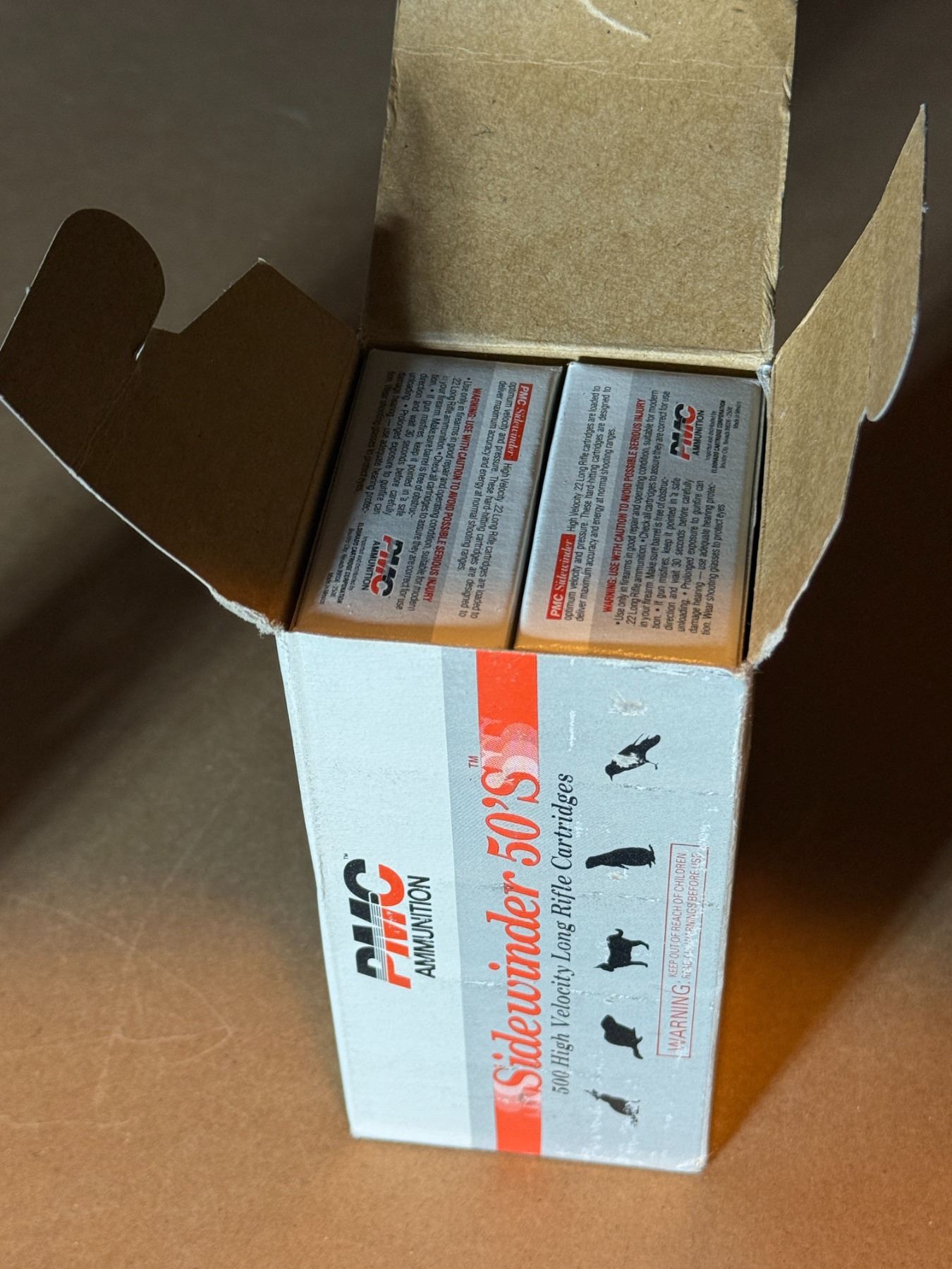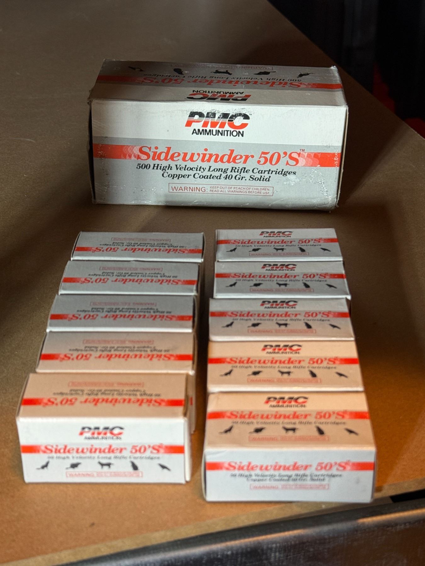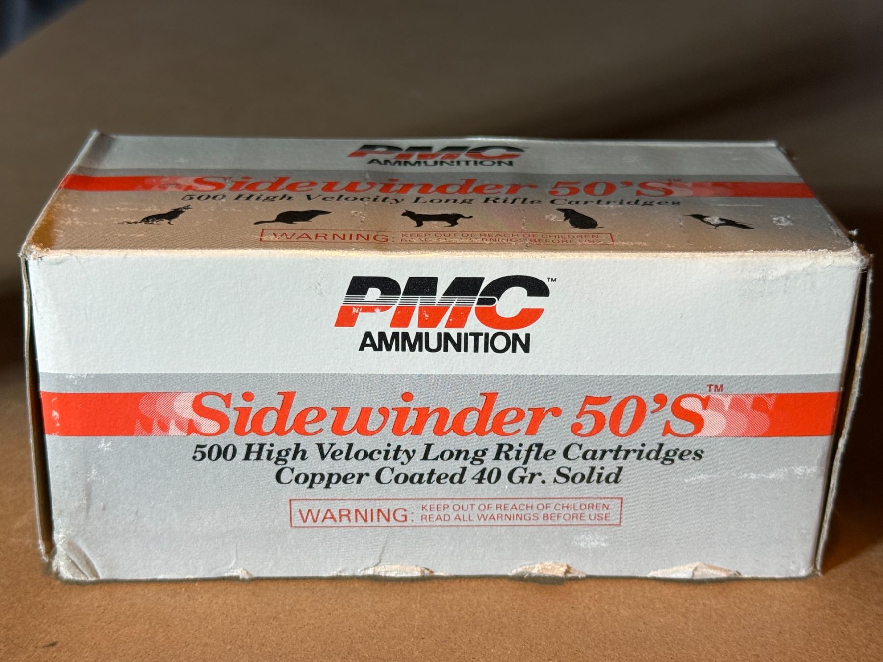500 high velocity long rifle cartridges. Copper coated 40 gr. Solid. PMC ammunition Sidewinder 50'S.