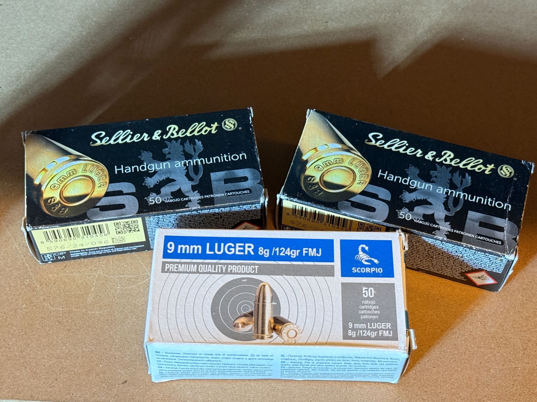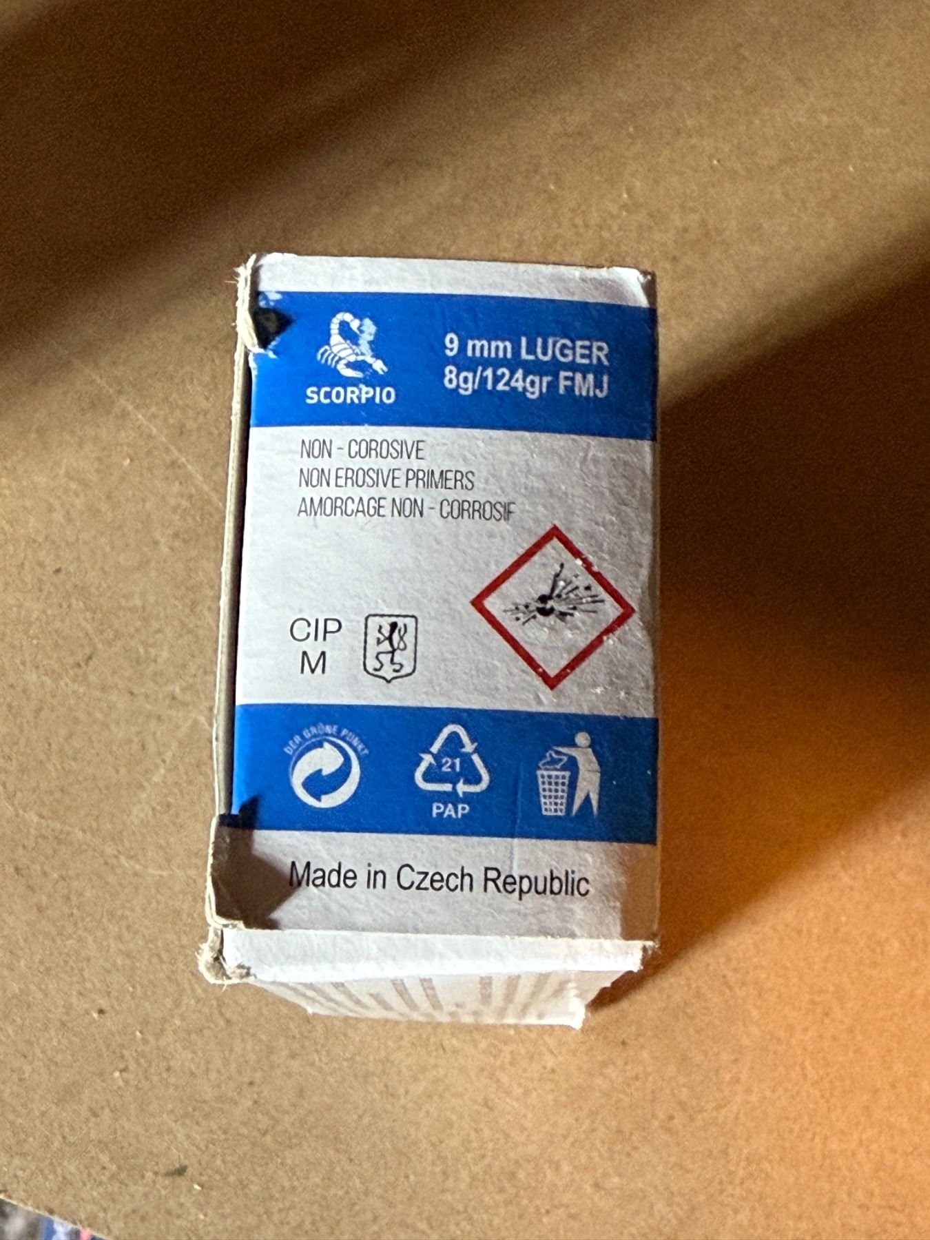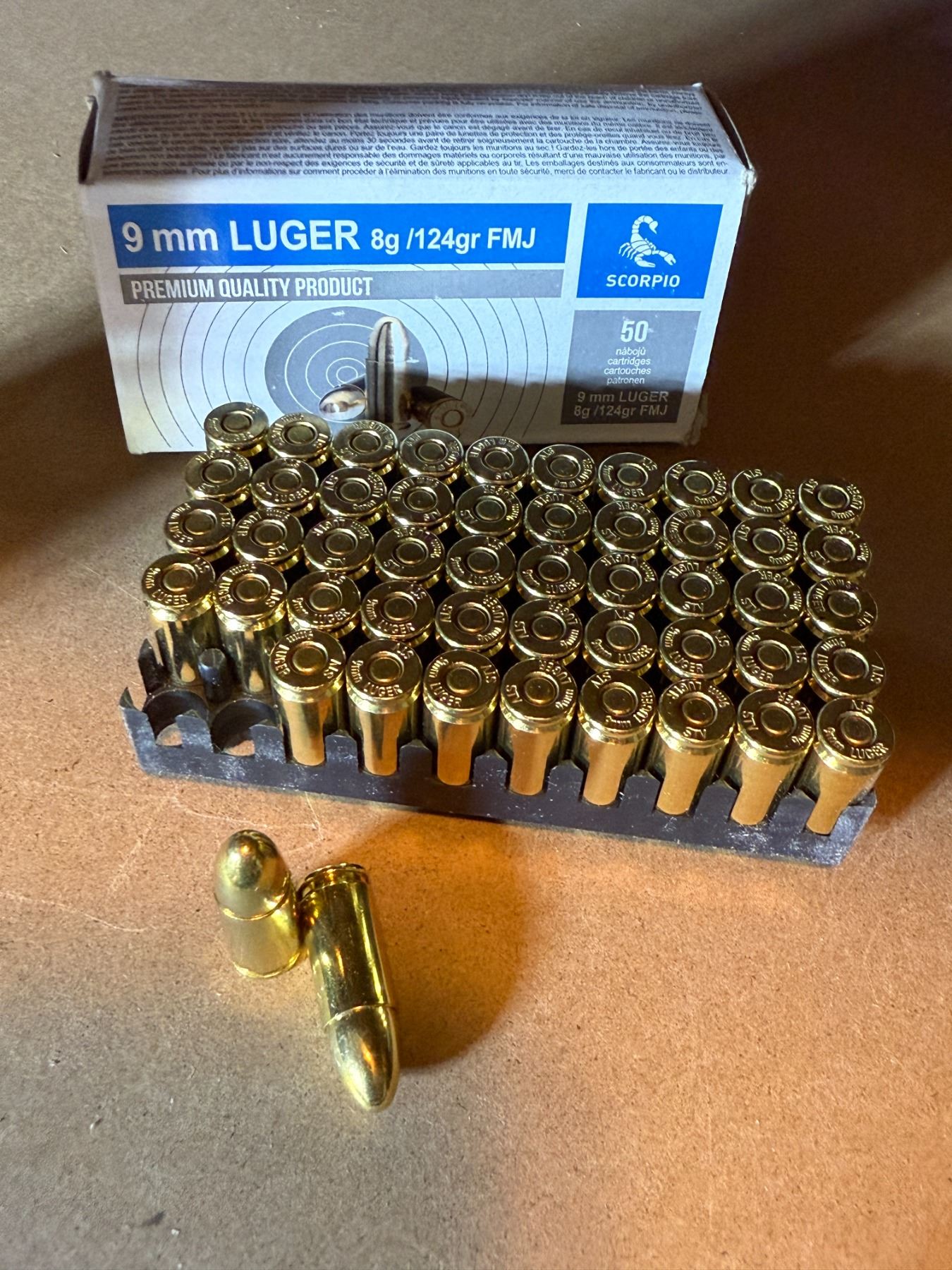 Box 3: Scorpio 9 mm Luger. 124 gr, 8 g. FMJ. 1 box of 50.