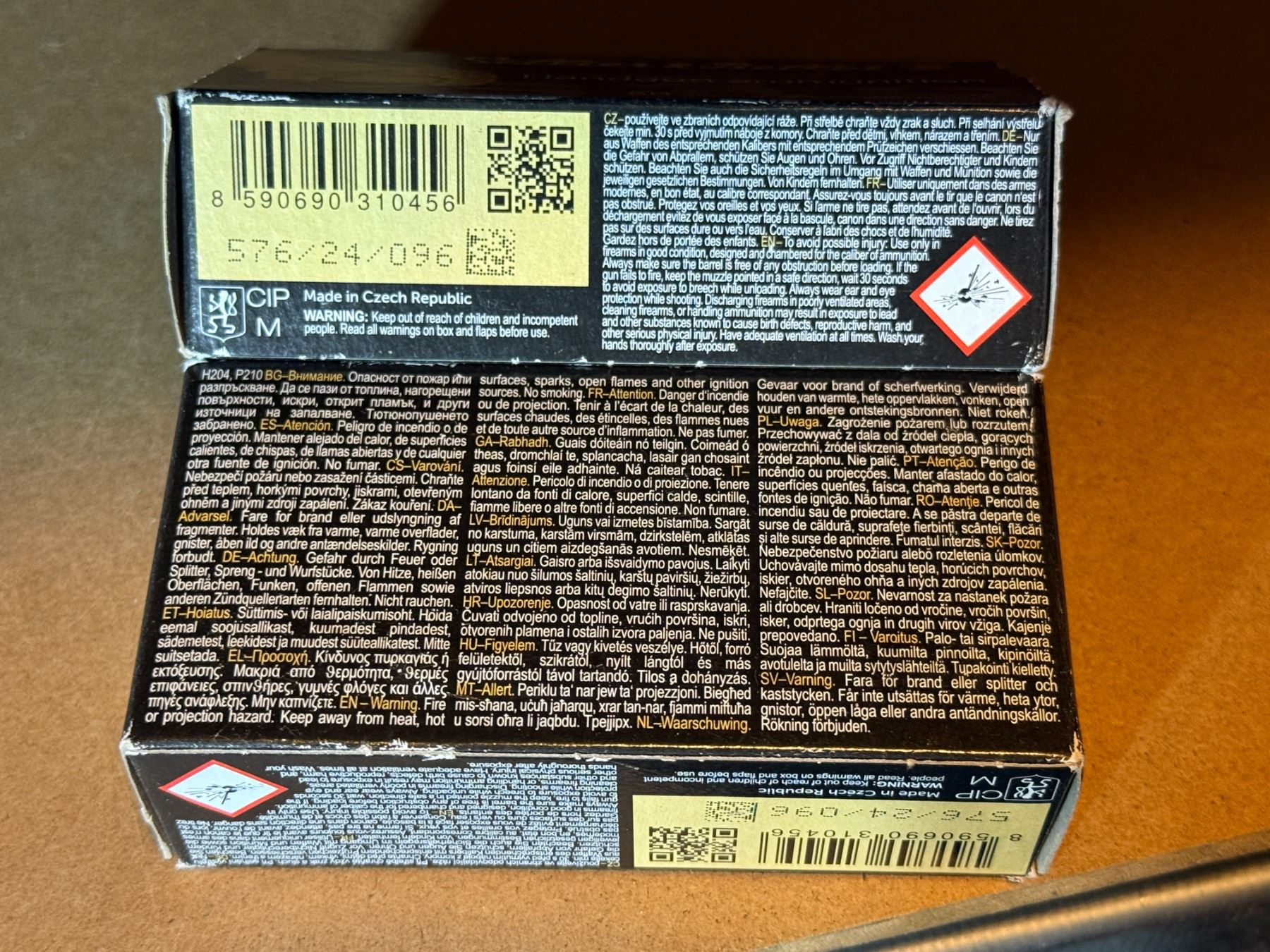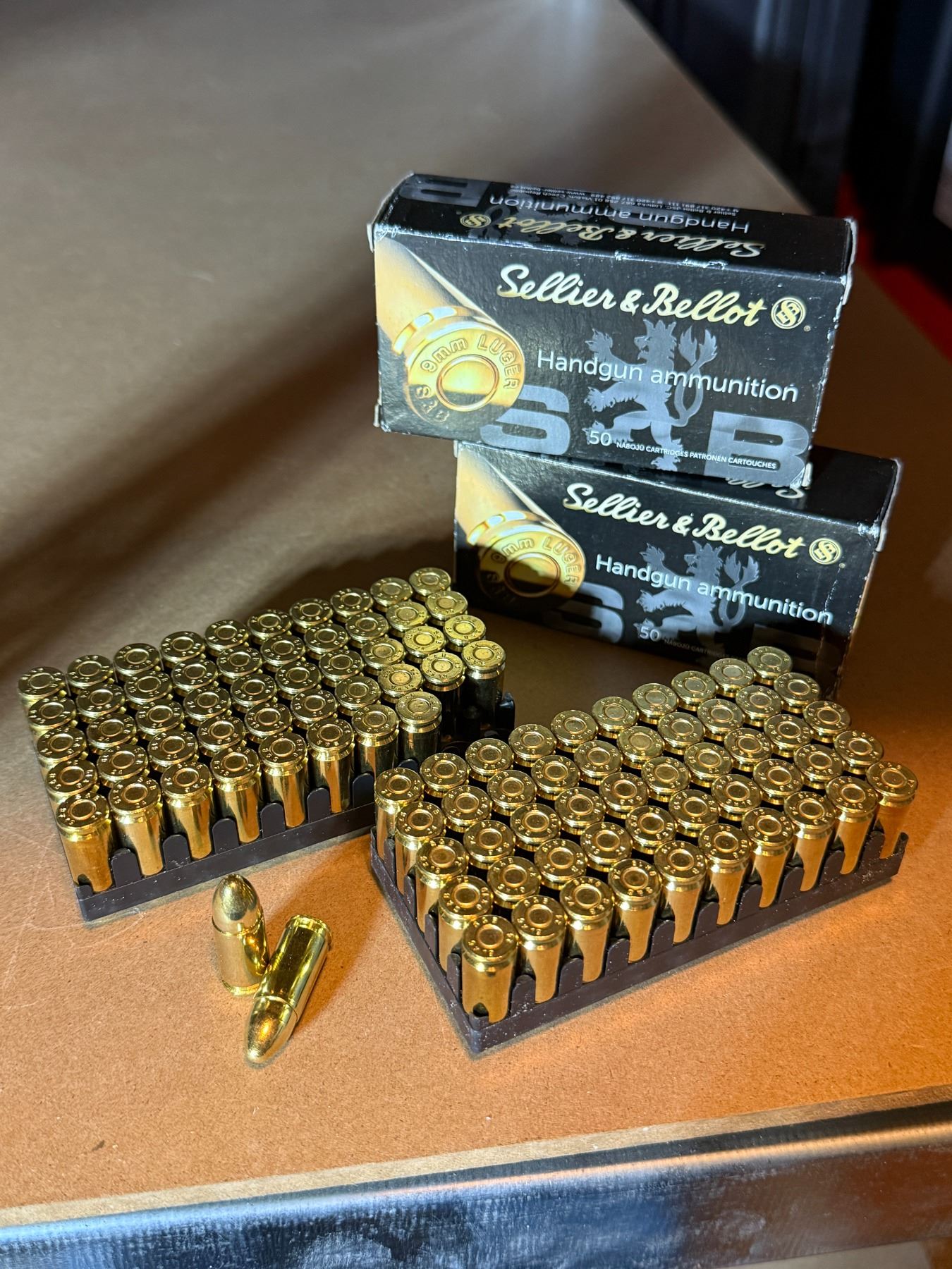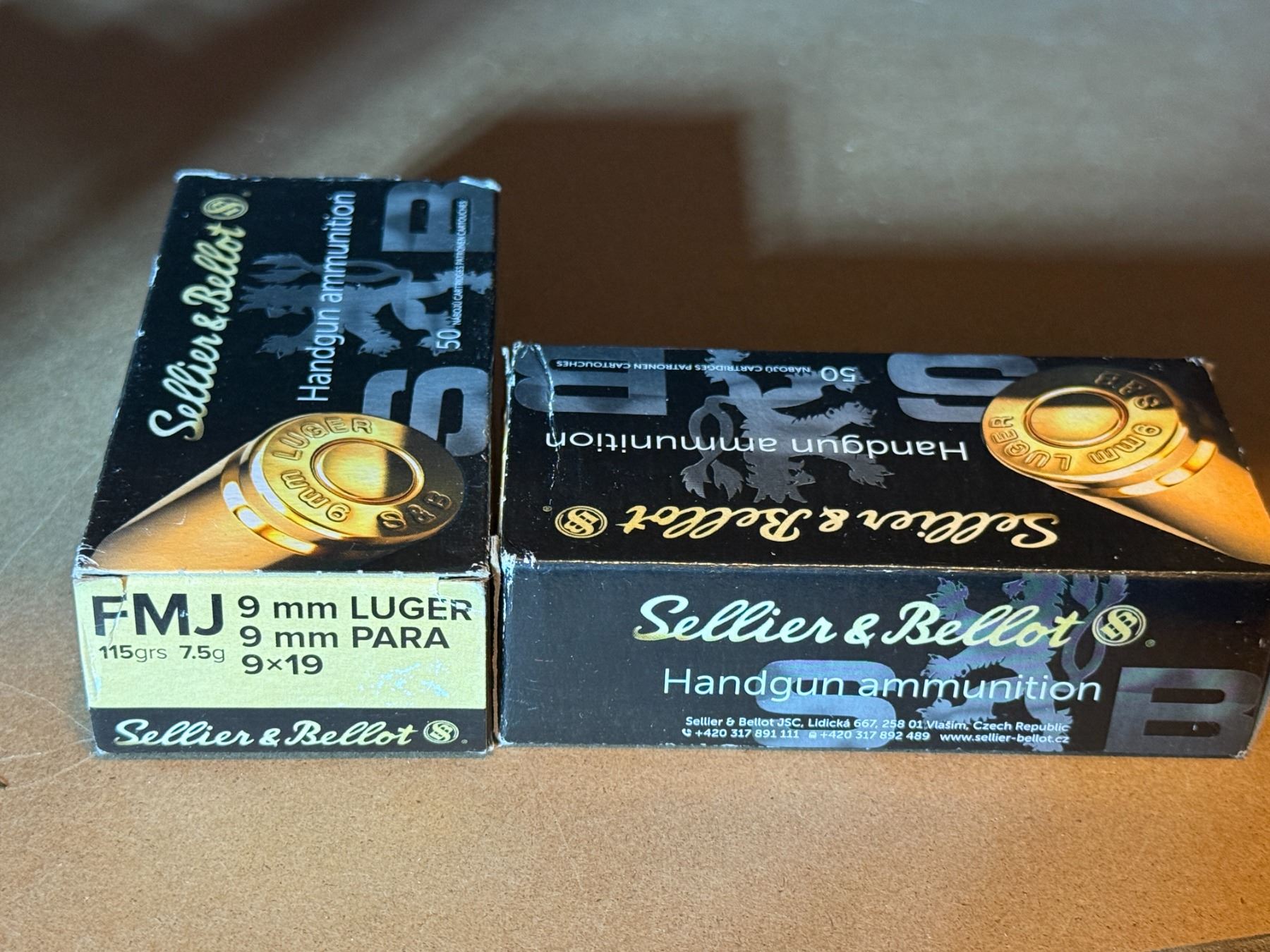 Box 1 & 2: Sellier & Bellot 9 mm Luger. 9 x 19. 115 grs, 7.5 g. FMJ. 2 boxes of 50.