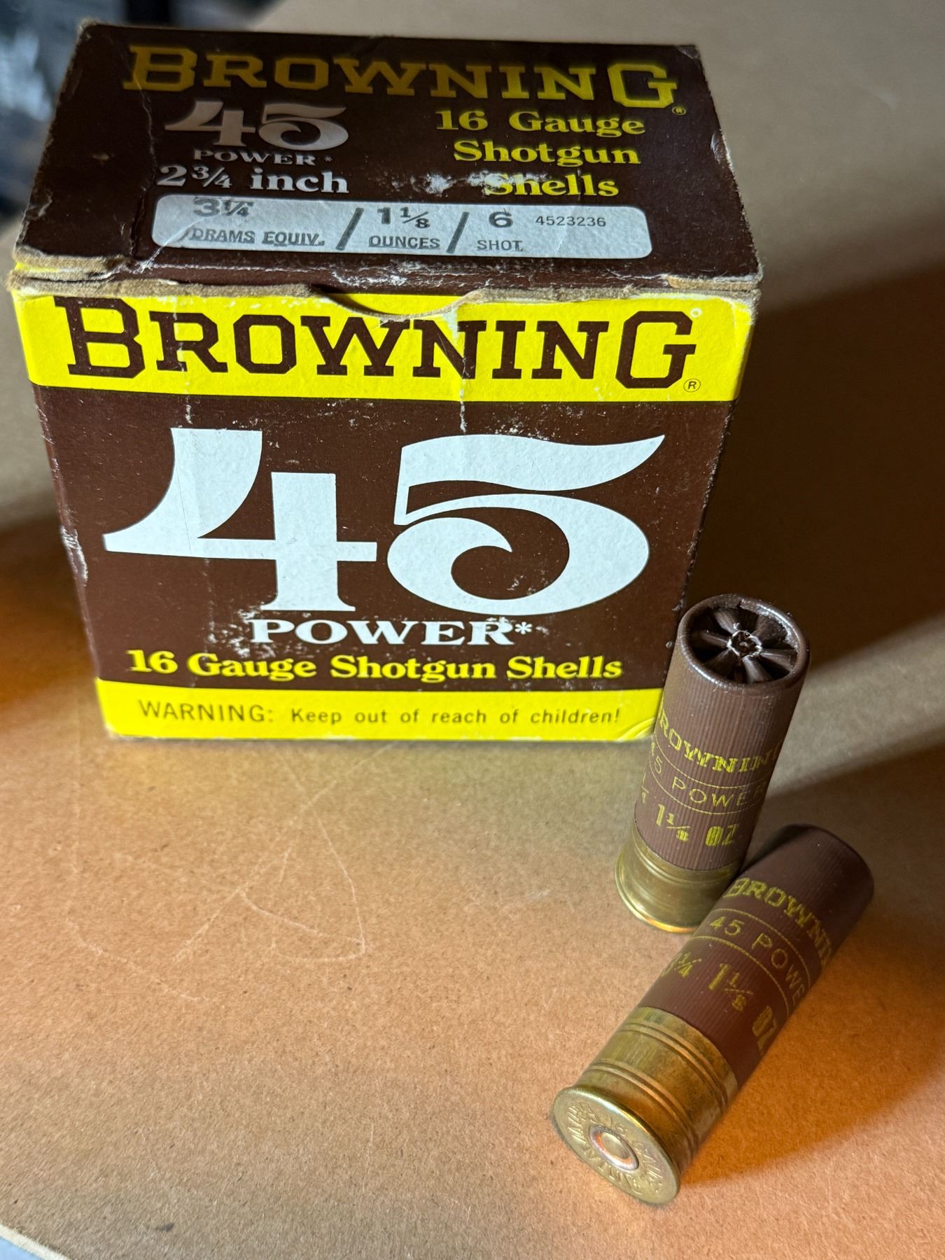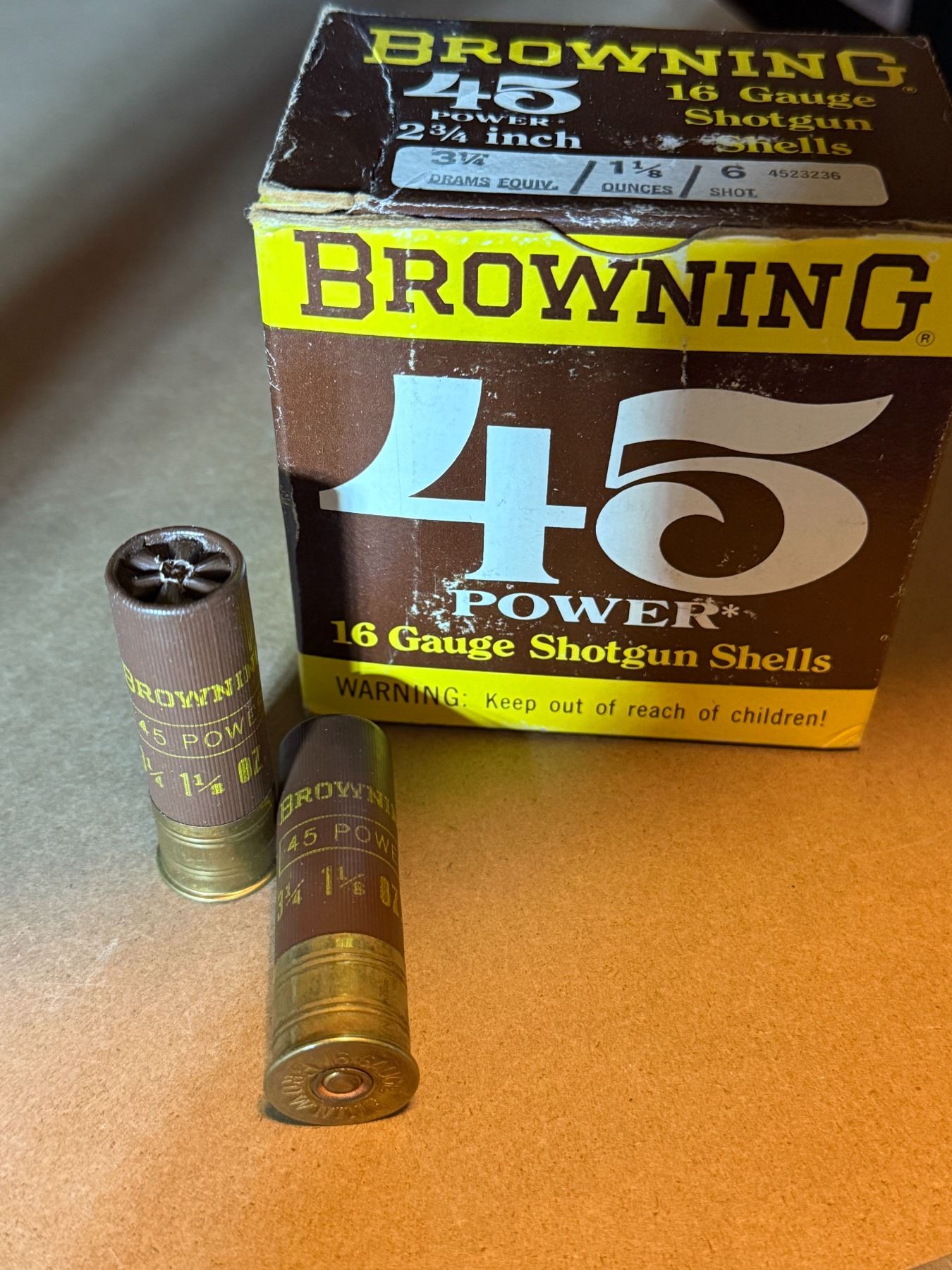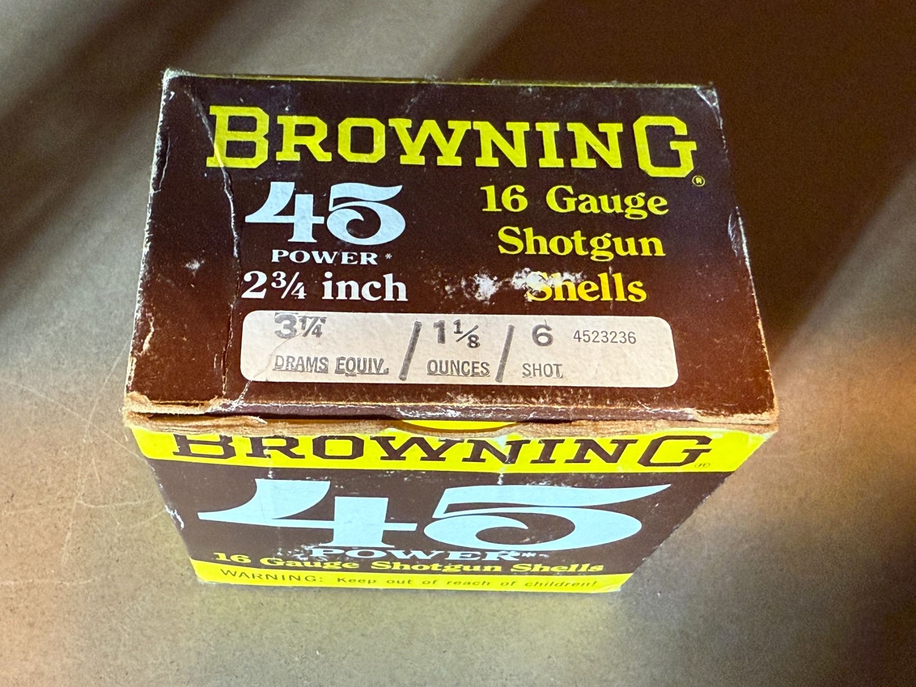 16 Ga 3 1/4" Drams Browning 45 Power Shotgun Shells. 6 Shot. Box of 25