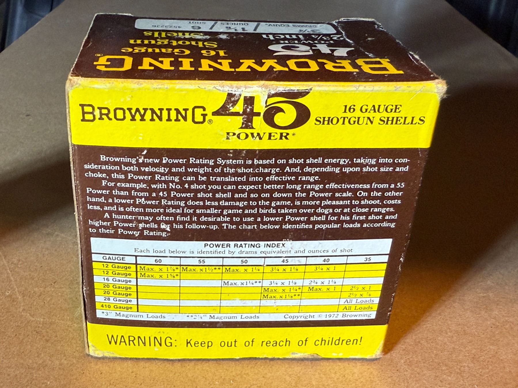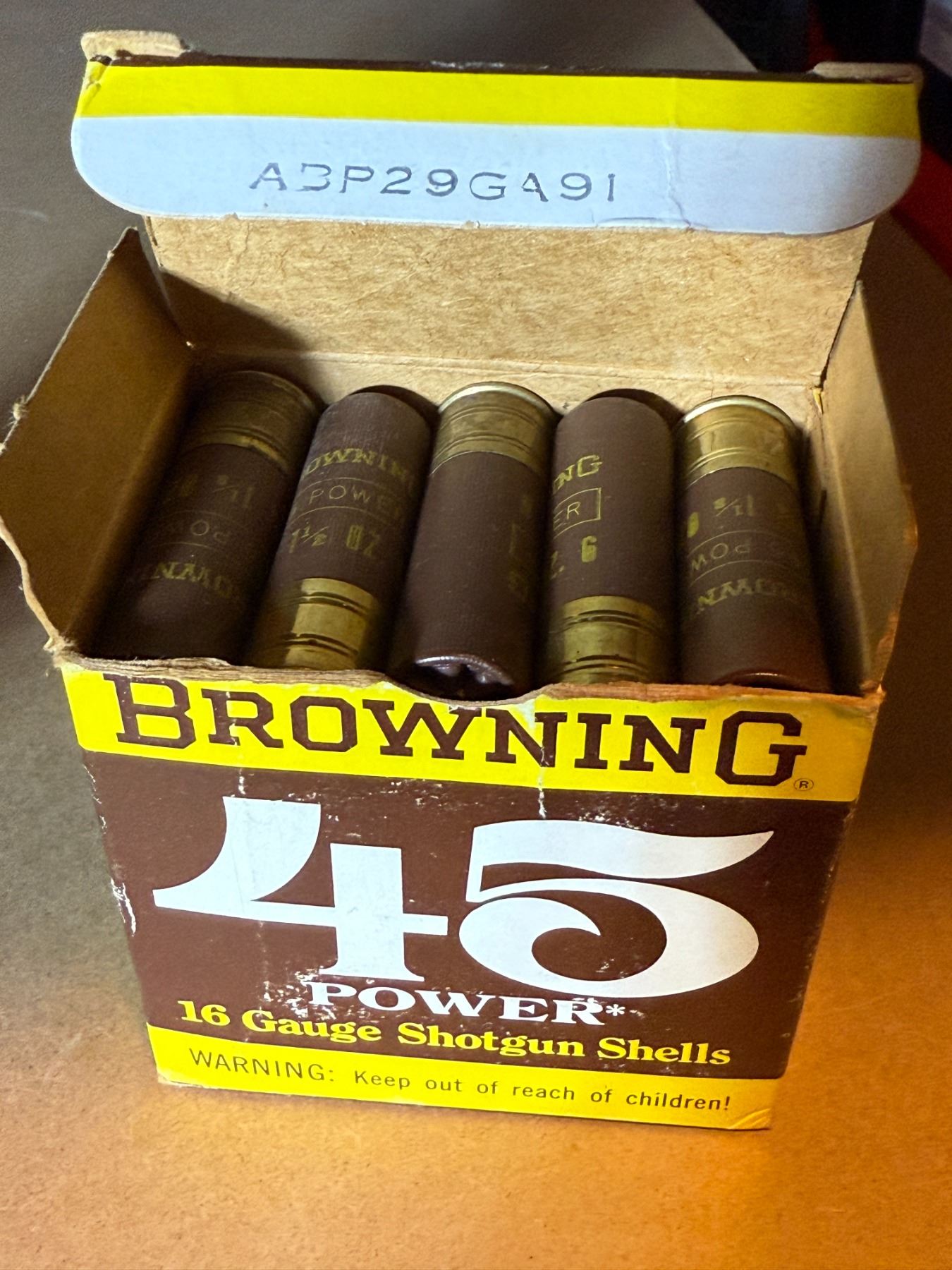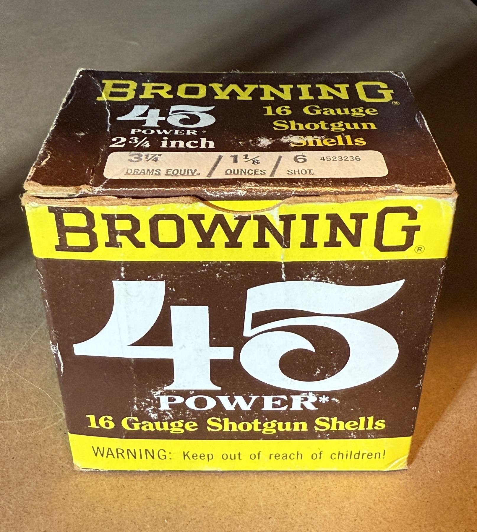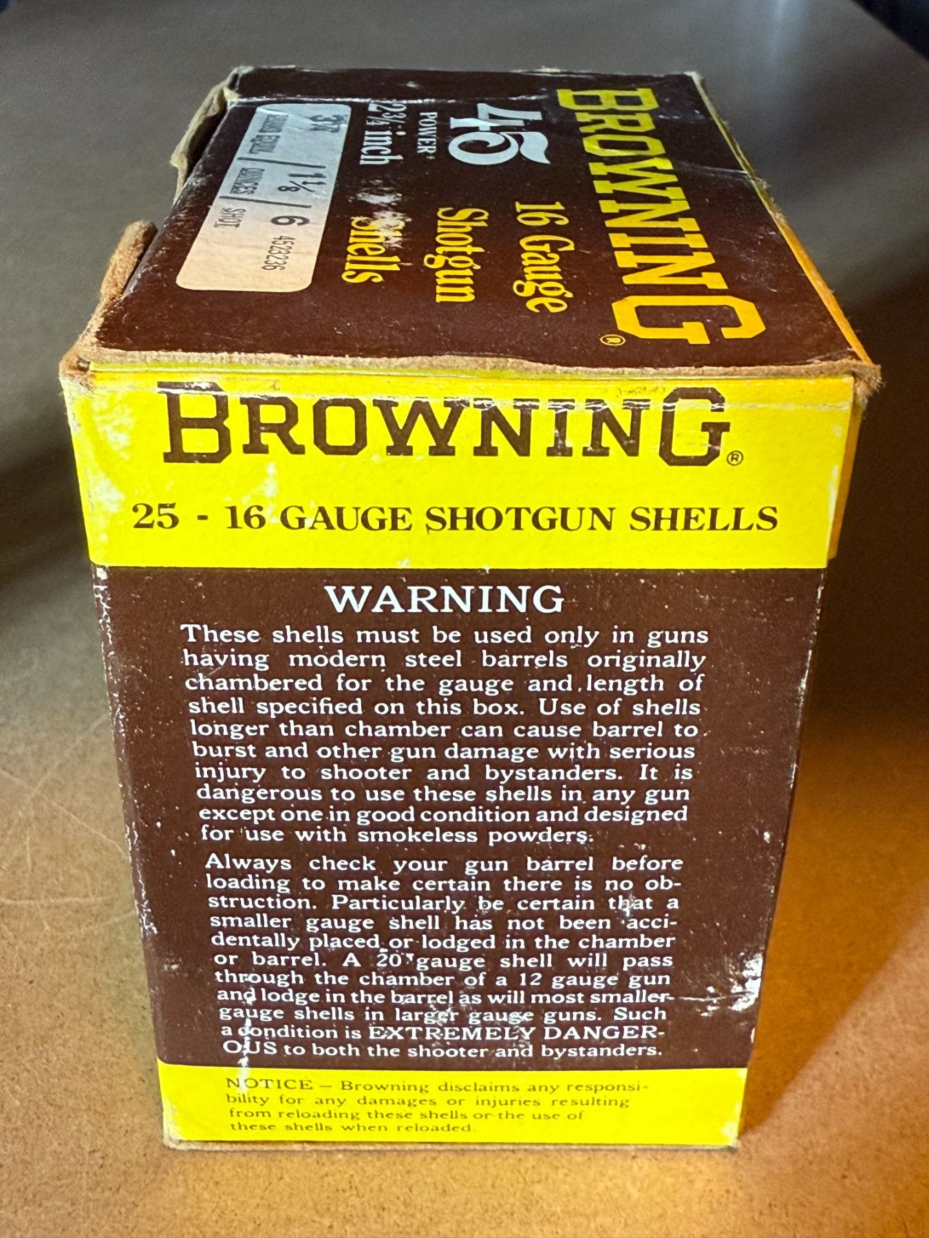 16 Ga 3 1/4" Drams Browning 45 Power Shotgun Shells. 6 Shot. Box of 25