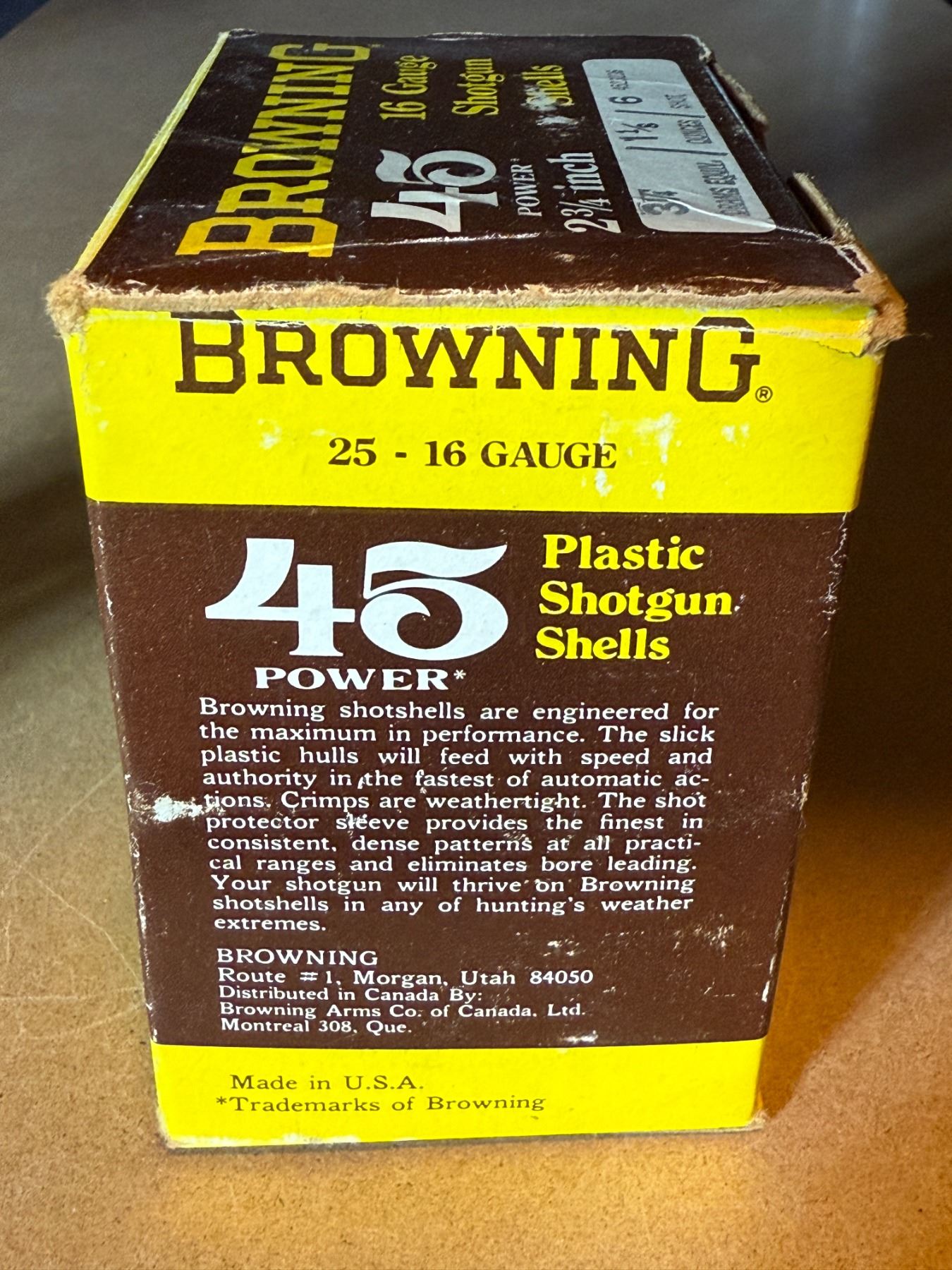 Lot 376 16 Ga 3 1/4" Drams Browning 45 Power Shotgun Shells. 6 Shot. Box of 25