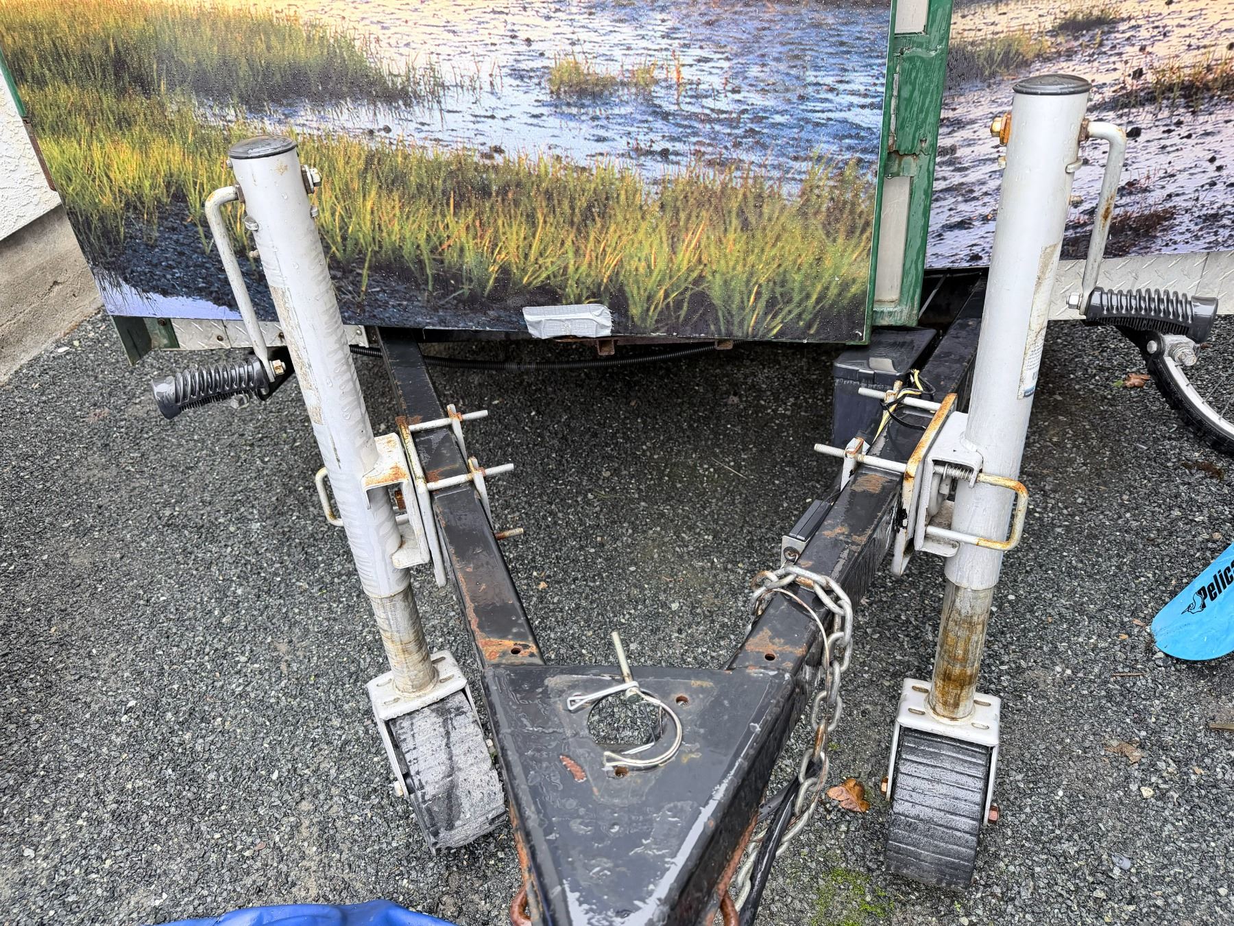 Standard enclosed single axle utility/cargo trailer that has been professionally converted into a portable pneumatic shooting booth. With fenders. Double swing out barn-style rear doors. Exterior vinyl wrap. 6' x 10'.