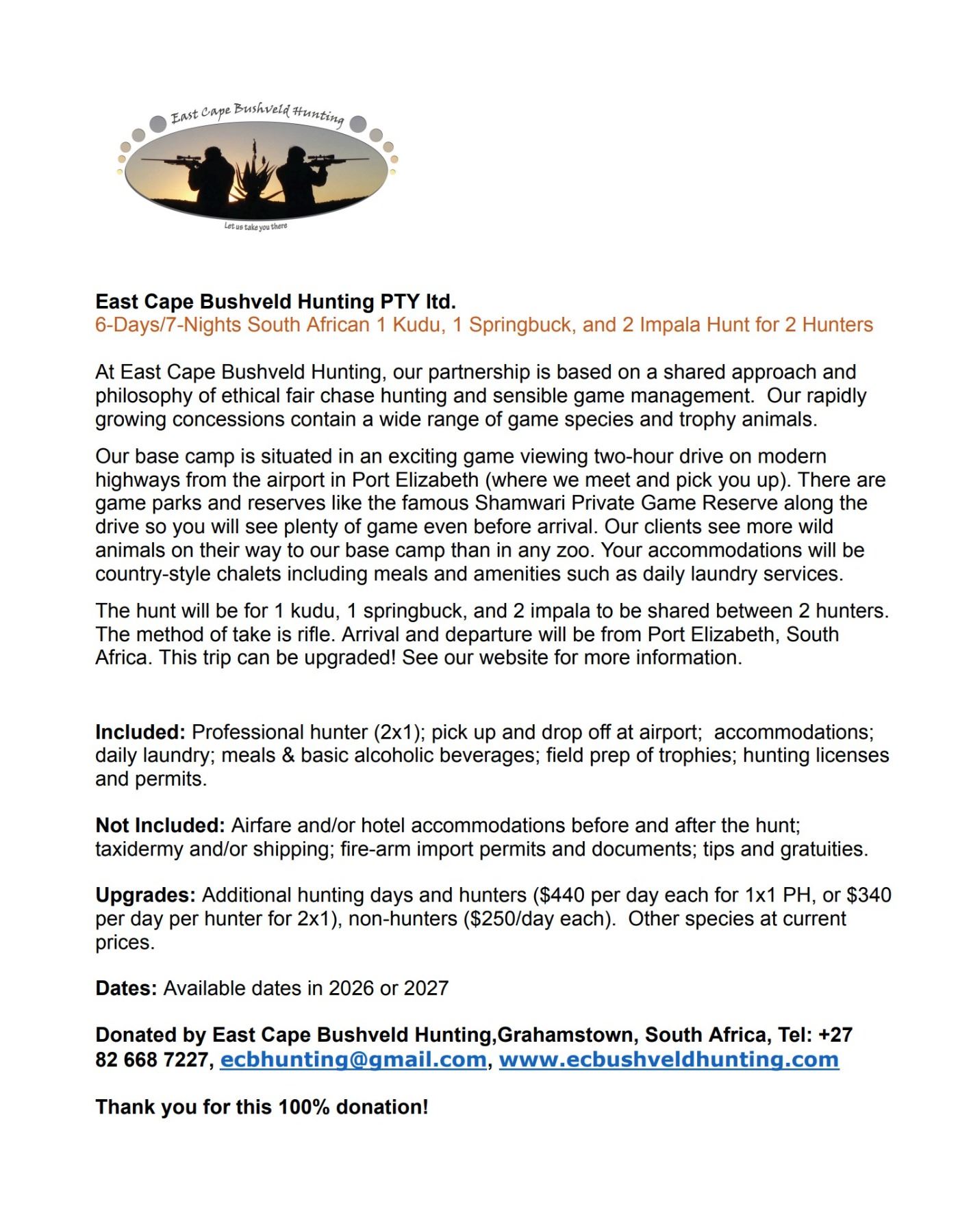 Donated by East Cape Bushveld Hunting,Grahamstown, South Africa, Tel: +27 82 668 7227, ecbhunting@gmail.com, www.ecbushveldhunting.com