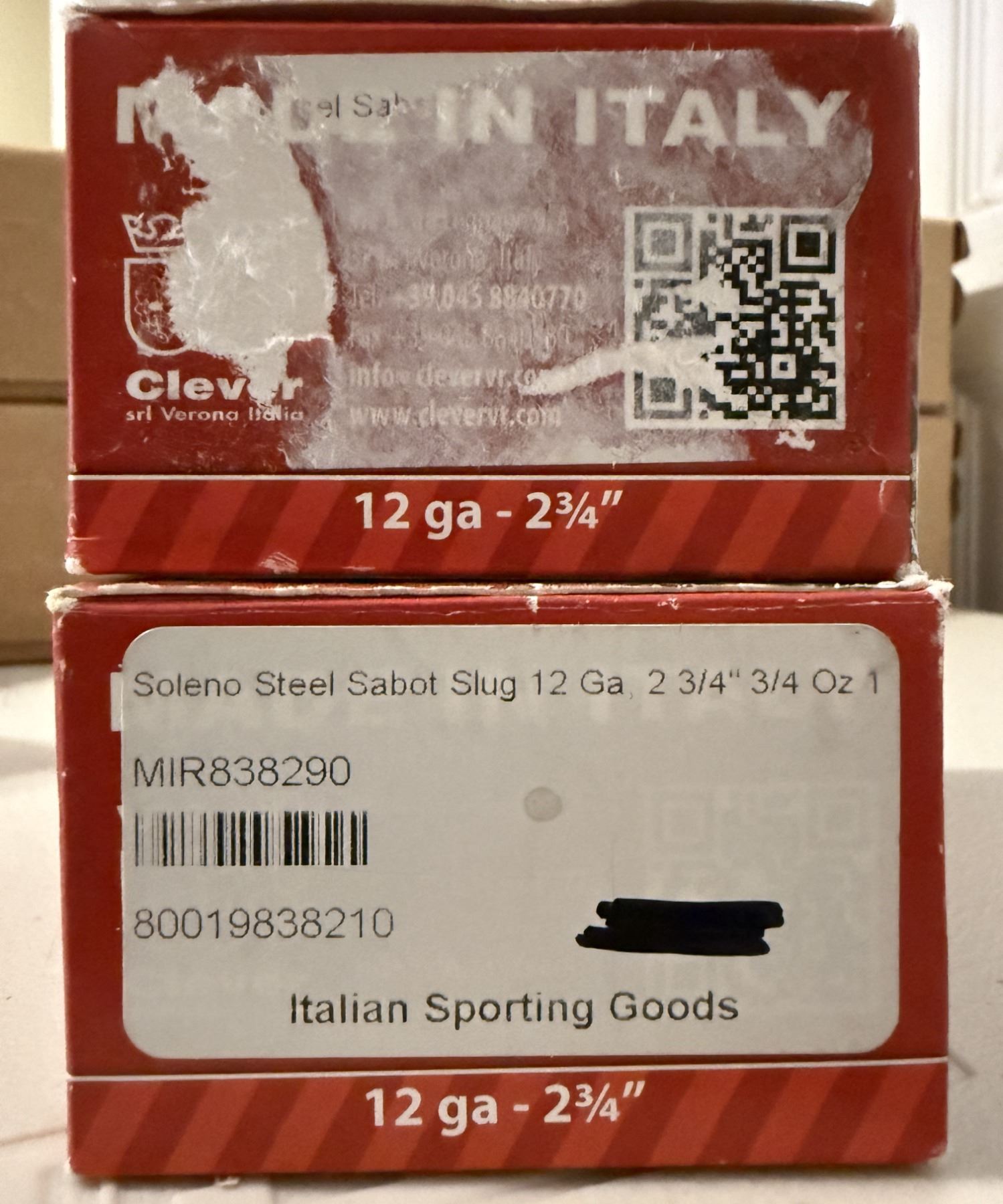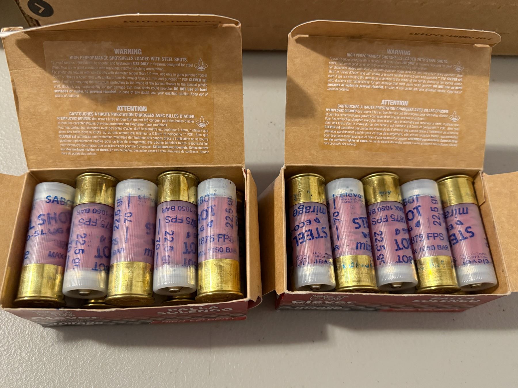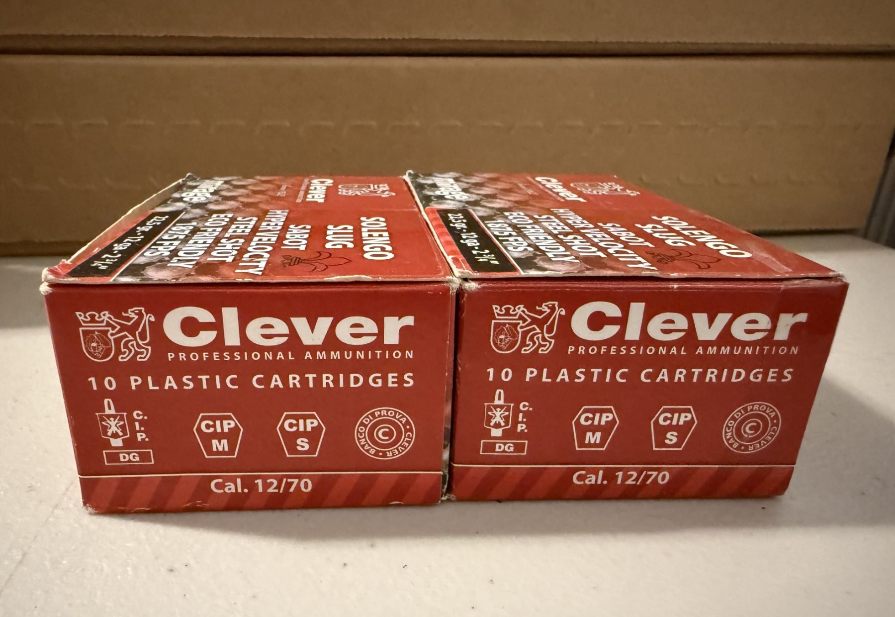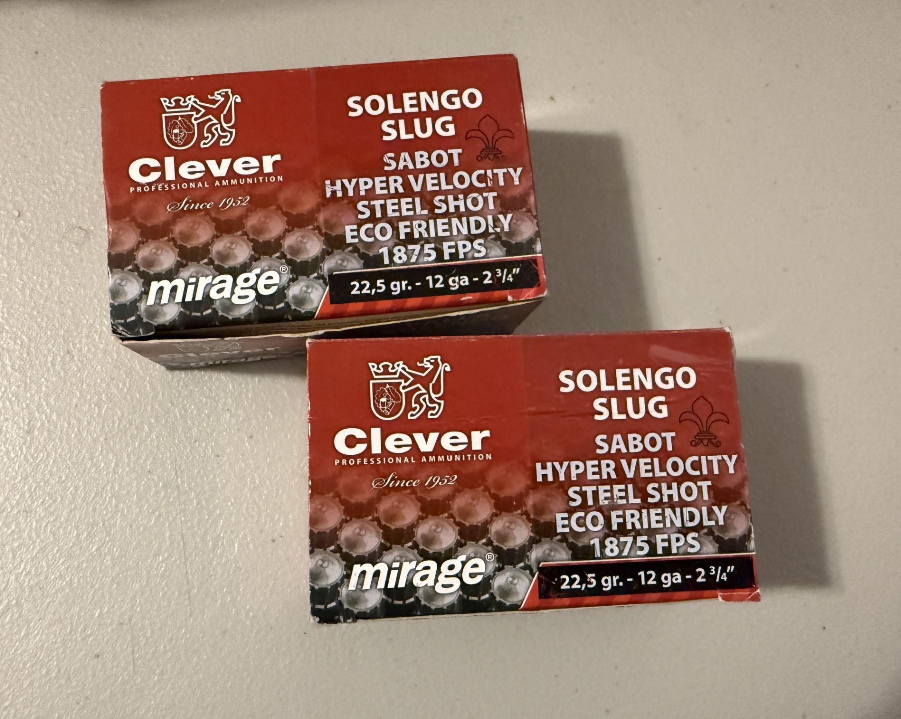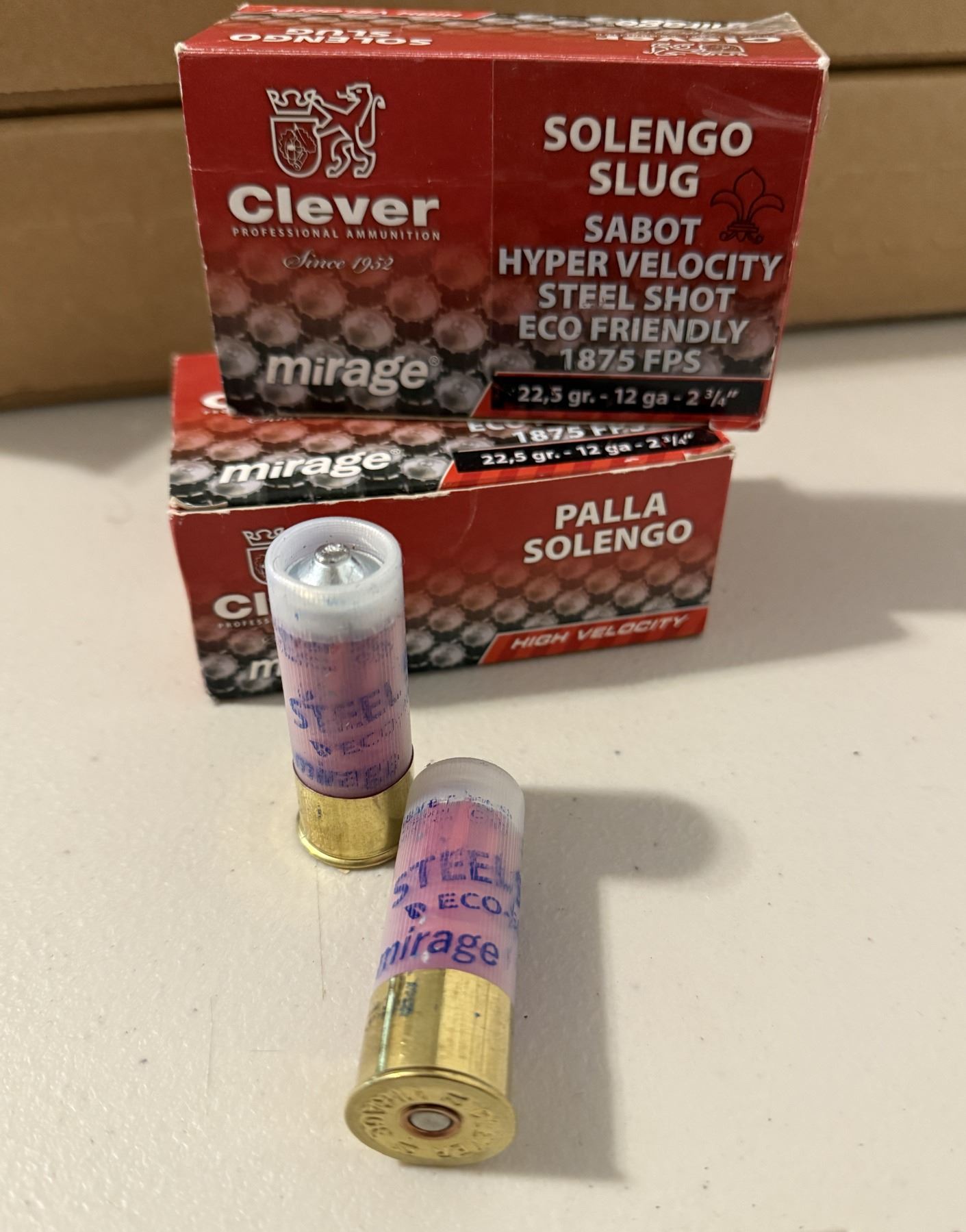12ga 2-3/4" Clever Mirage Solengo Slug Sabot Hyper Velocity Steel Shot. 1875 FPS. Made in Italy. 2 full boxes of 10 each.