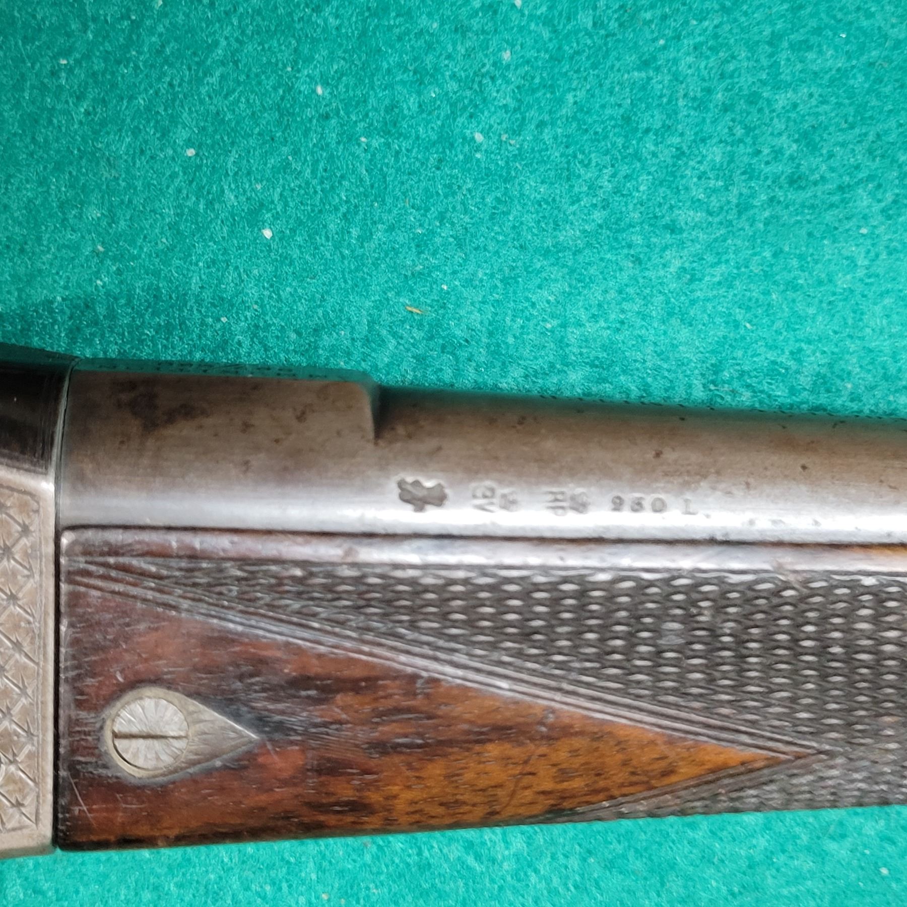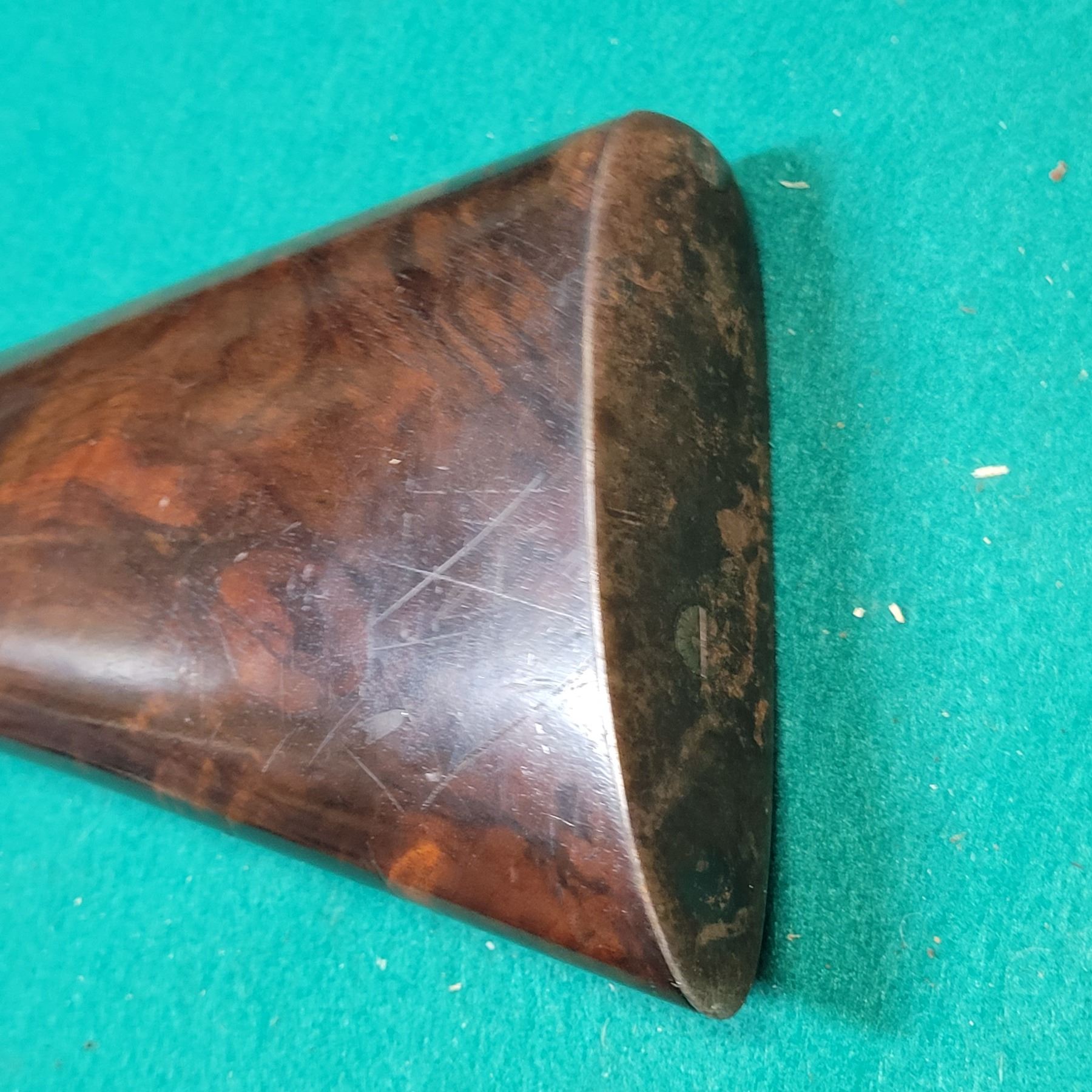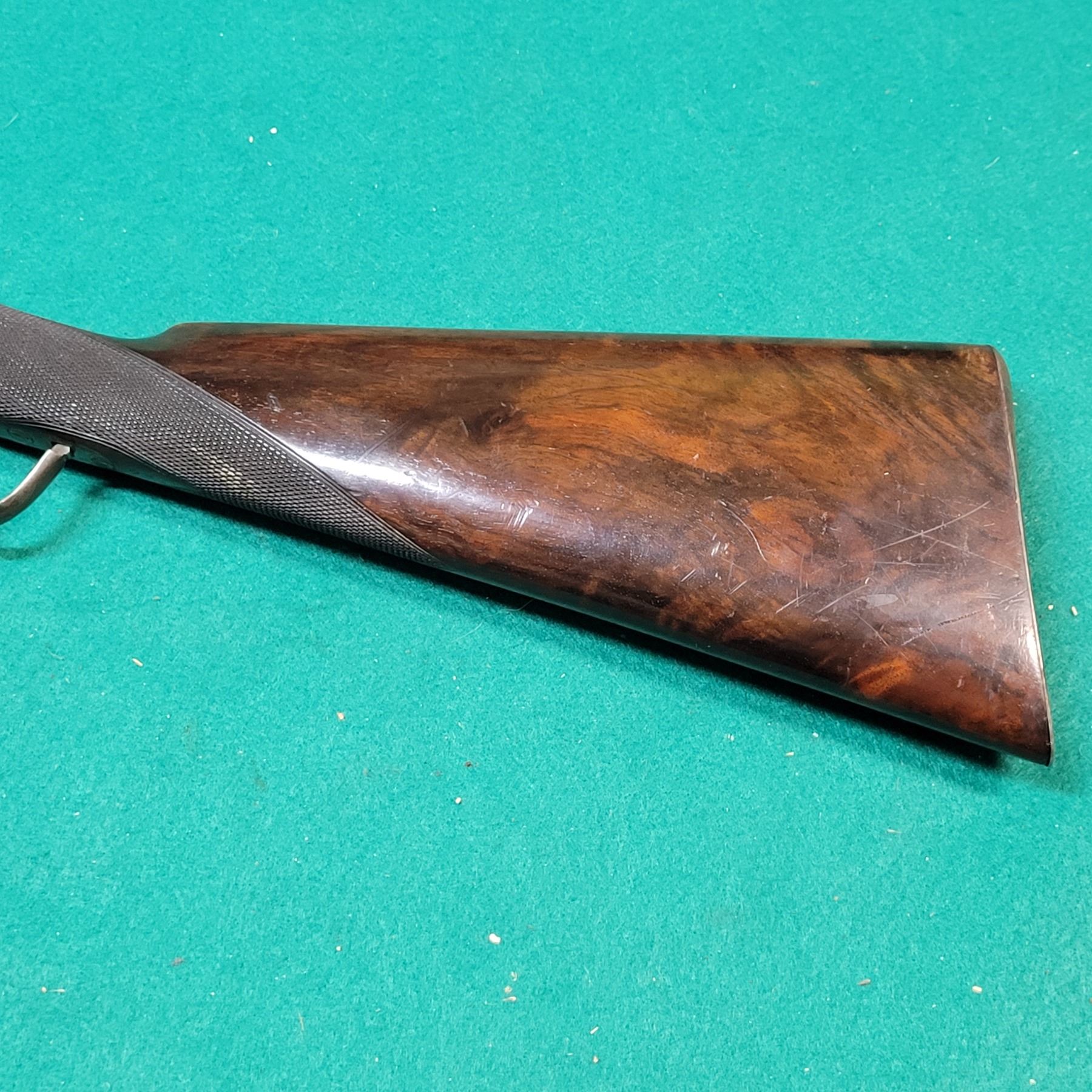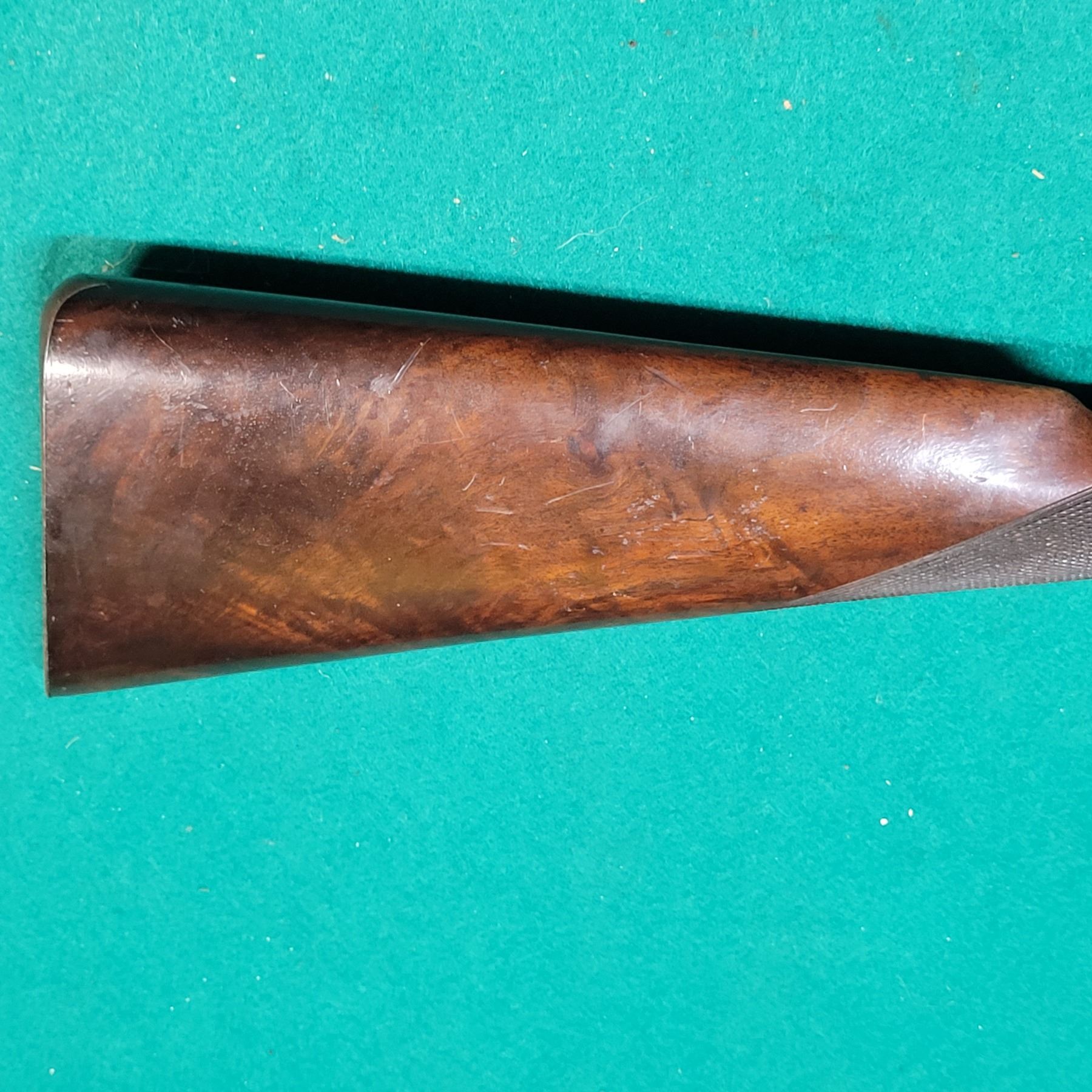 The stock is fancy walnut with checkering & a Horn forend tip. There are some light scratches and dents in the wood. See photos.