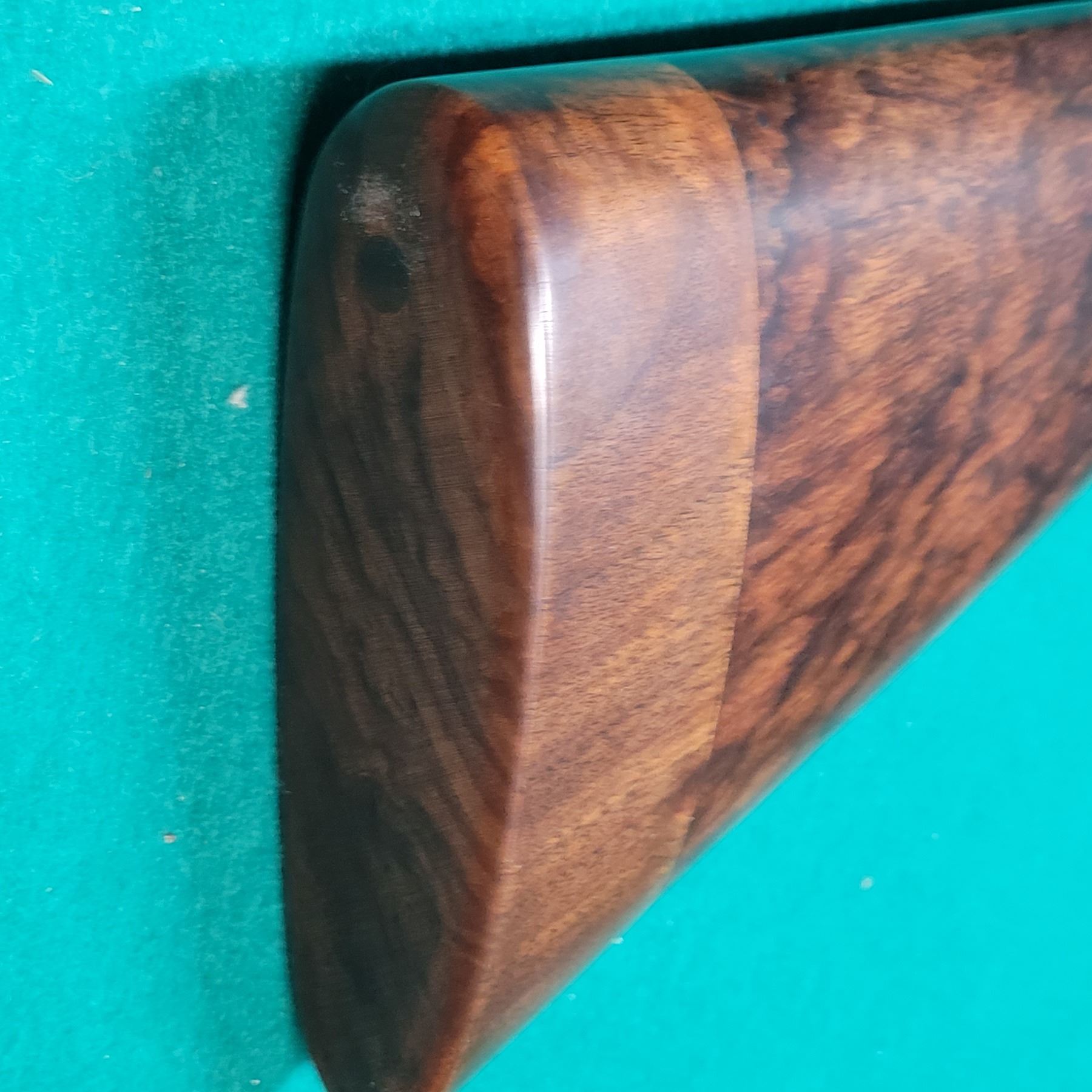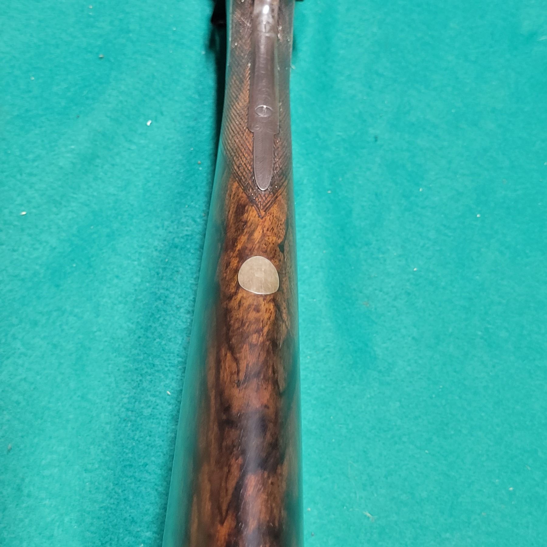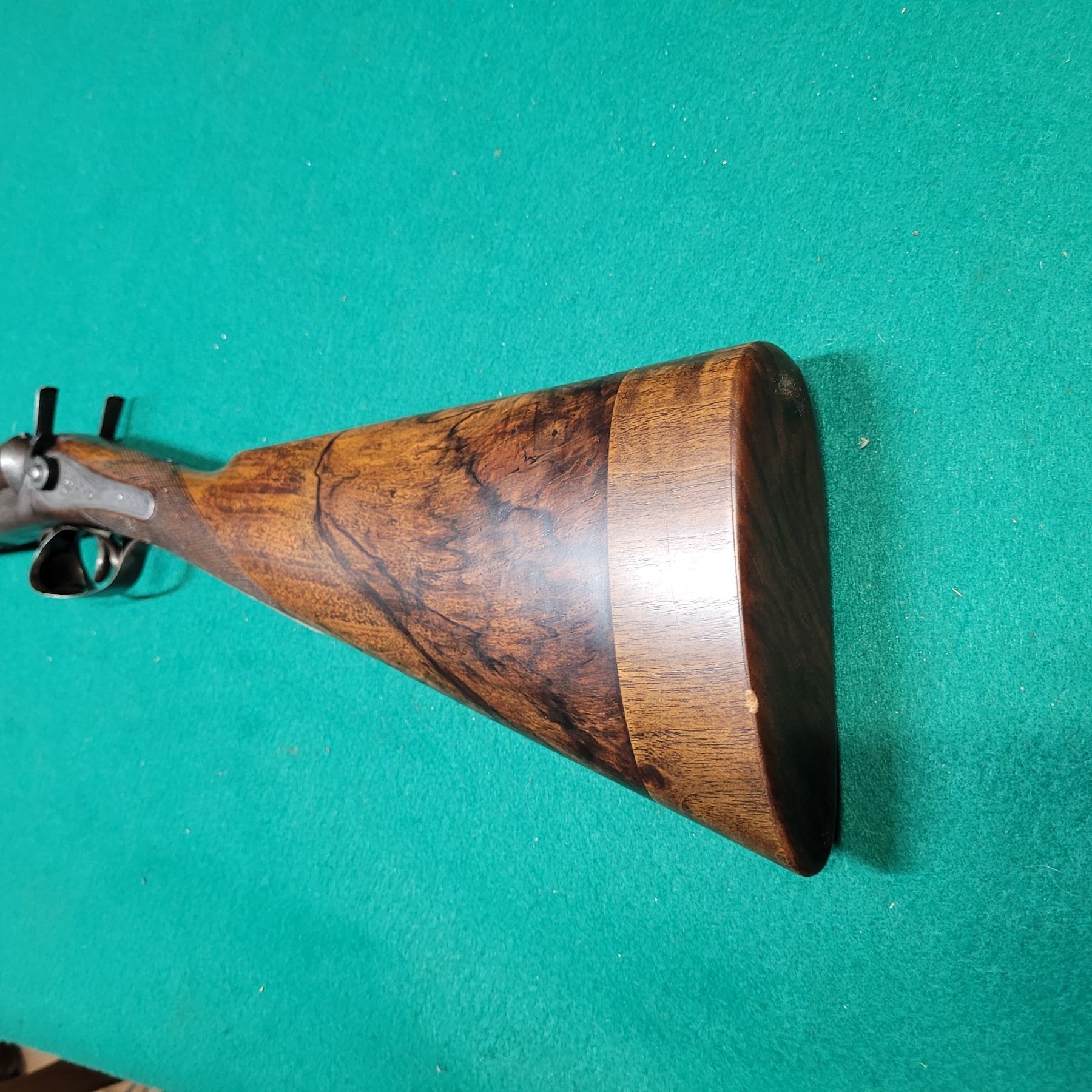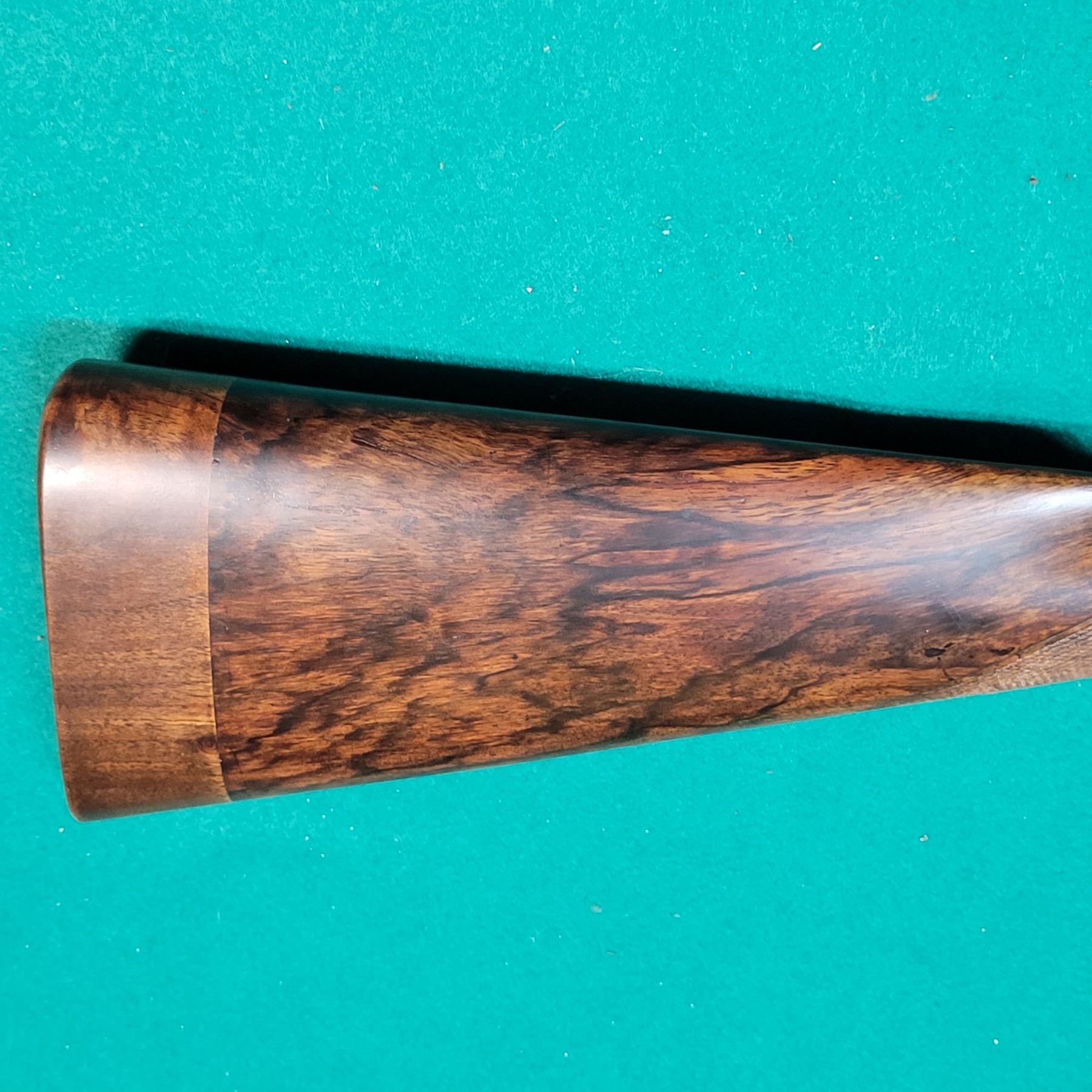 The stock is made from Highly Figured Walnut with a Bone forend tip. The Buttstock has a 1 7/8" extension giving it a 15" Pull. The stock is in good condition with minor dents and markings. Checkering is in good condition.