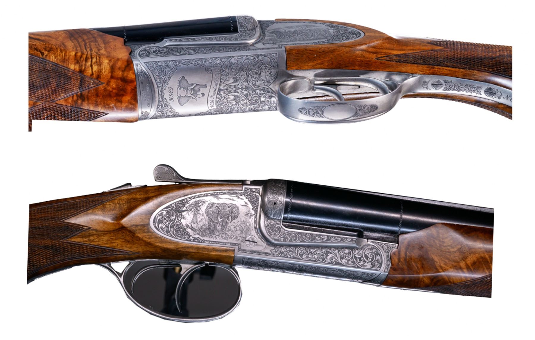 Presenting the 2026 HSCF President's Rifle! This one-of-a-kind firearm, commissioned by 2025-2026 HSCF President Jeff Garrett, could be yours! Presenting the Chapuis Elan Side-by-Side Double Rifle , African, with sideplates and a manual safety chambered in .470 Nitro Express. Interchangeable barrels (27.5") and a forend complete this package to transform this firearm into a 12G shotgun. You can hunt big game and birds on the same trip with this firearm. The engraving features African Dangerous Game on the sides, the HSCF Logo and “2026 President’s Rifle” on the bottom of the action. The stock is made from 4-Star Circassian (Turkish) walnut, with a hand-checkered German cheekpiece. The barrel is 24” complete with multiple sights: 1, standing, 3 folding express and a front blade and flip-up night sight. The rifle accepts Recknagel Mounts and has a Red Dot adaptor. This package is completed with an upgraded “Artisan” case for the 2-barrel set.