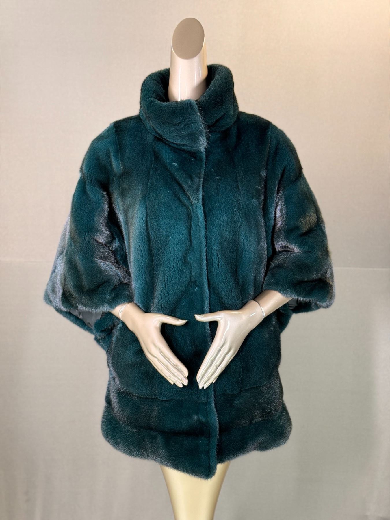 Alaska Fur Gallery presents a 30-inch long Mink cape, reversible to puffer, featuring dual pockets on both sides in a beautiful midnight green color. HSCF thanks Alaska Fur Gallery for this generous donation.