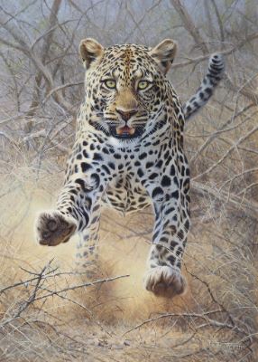 This captivating piece, measuring 22 x 30 inches and framed in a hand finished gilded floating frame which vividly portrays the fierce intensity of a Leopard charge. Peter Stewart, a South African wildlife artist, is celebrated for his highly representational wildlife art.