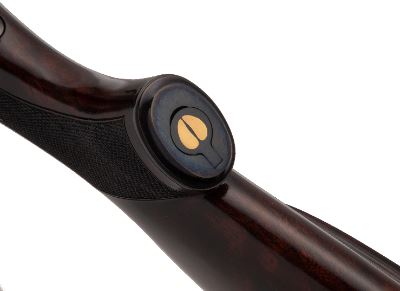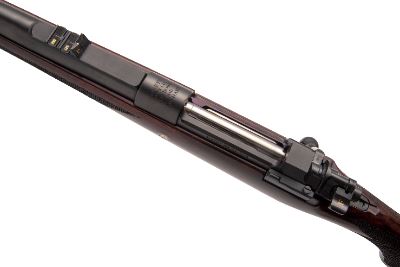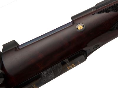 Built on Rigby’s Big Game Single Square Bridge action and chambered in .416 Rigby. Every surface speaks to purpose and pedigree: deep-blacked steel set with yellow-gold inlays—the Rigby “Double R,” buffalo motifs, sight marks, bolt monogram, recoil bar, and a Dagga Boy floorplate—matched to an exhibition-grade Turkish walnut (Grade 8) stock balanced for control under recoil.