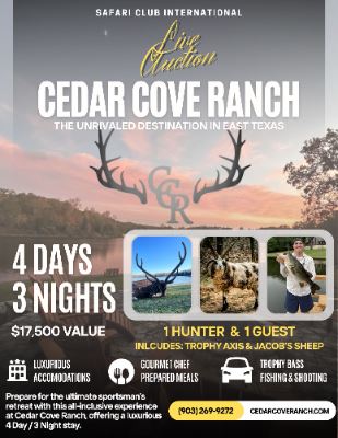 Trophy fees included for one Trophy Axis Deer and one Trophy Jacob's Sheep, generously provided by Cedar Cove Ranch.