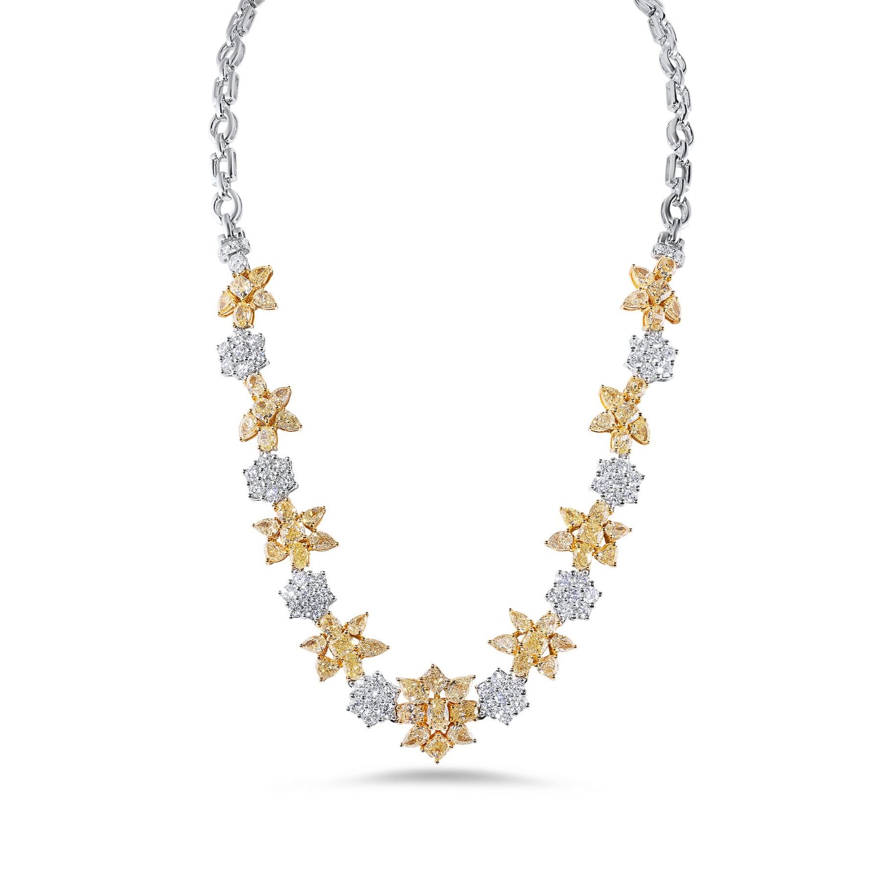 The interplay between the golden hues of the yellow diamonds and the crisp brilliance of the white diamonds creates a striking yet sophisticated presence at the neckline.