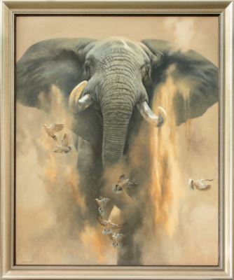 Measuring 60" x 48" unframed and 68" x 56" framed, this striking piece captures the raw energy and presence of a charging elephant in vivid detail.