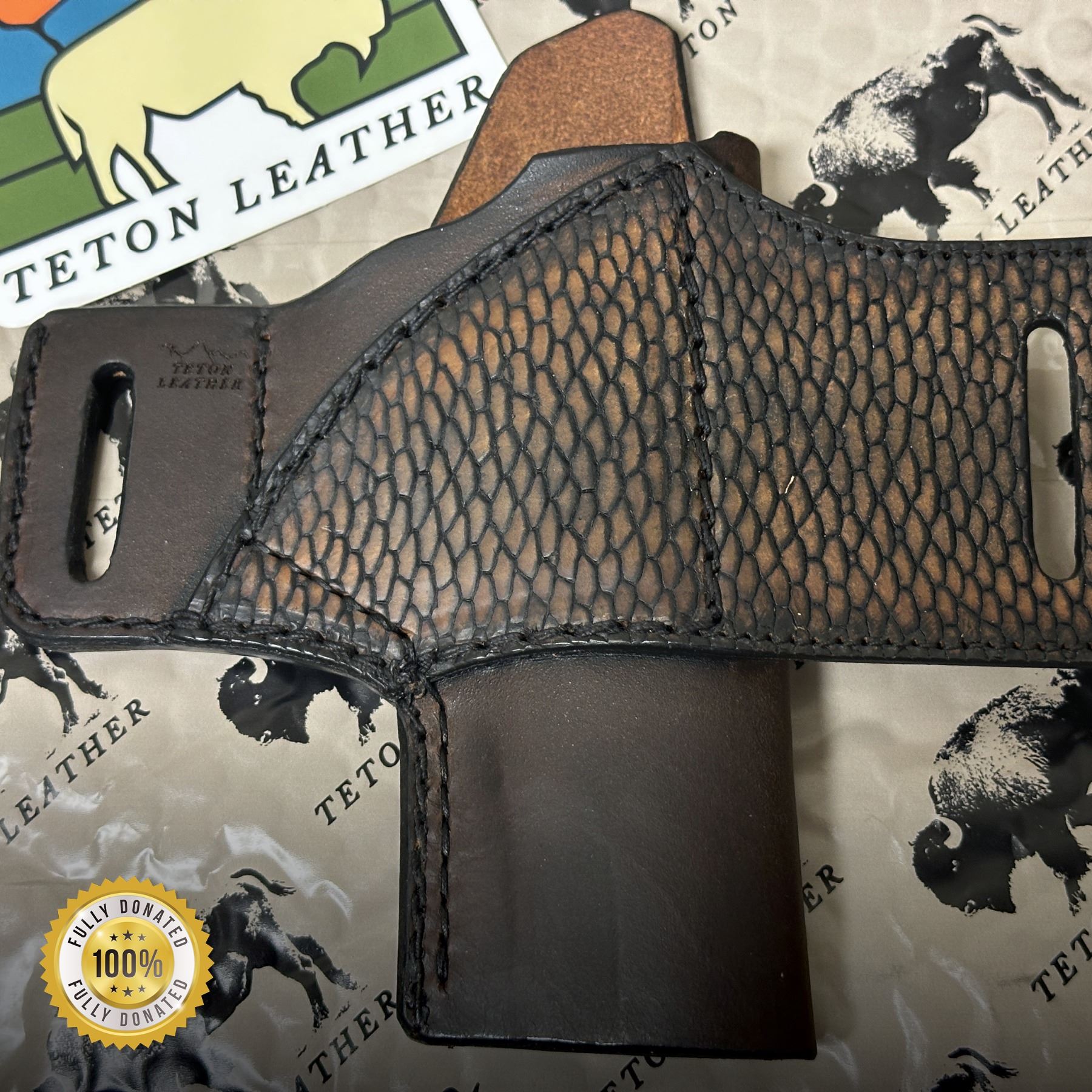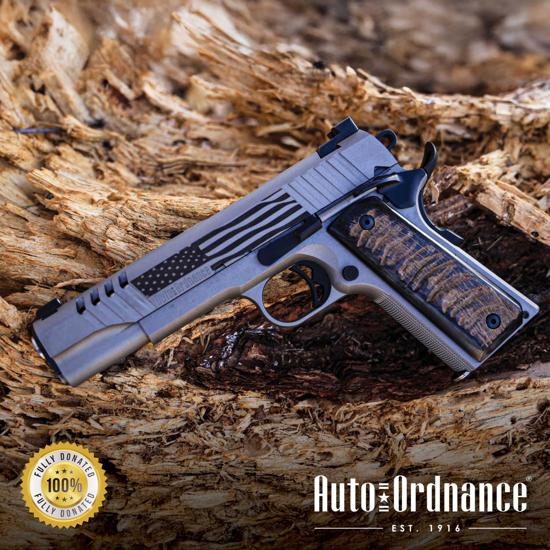 Custom engraved Auto Ordnance 1911 .45 ACP pistol, with ram grips and genuine beavertail leather holster made by Teton Leather Company.