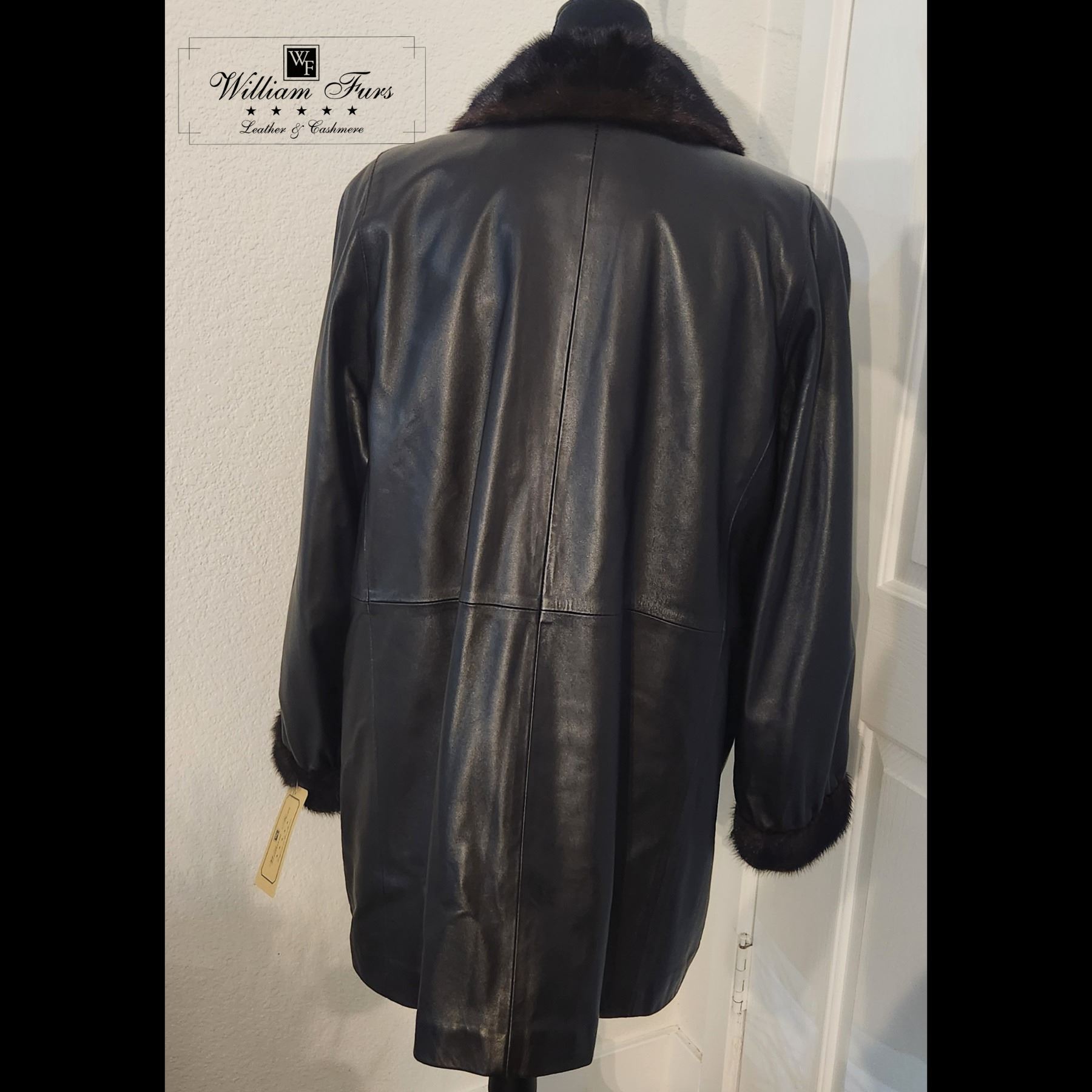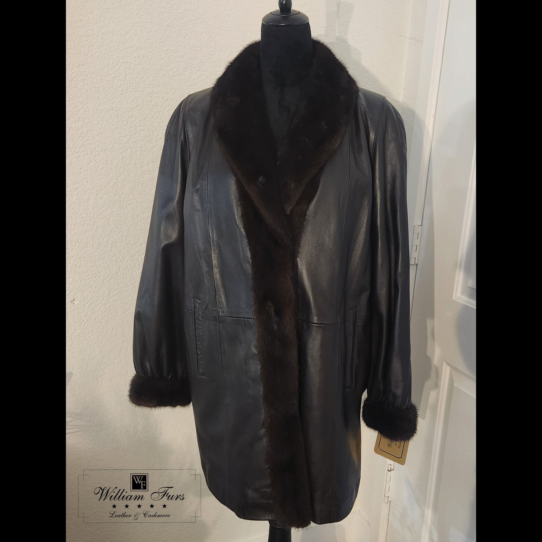 It's a rich dark brown leather stroller with natural mink trim and detachable sheared mink liner.