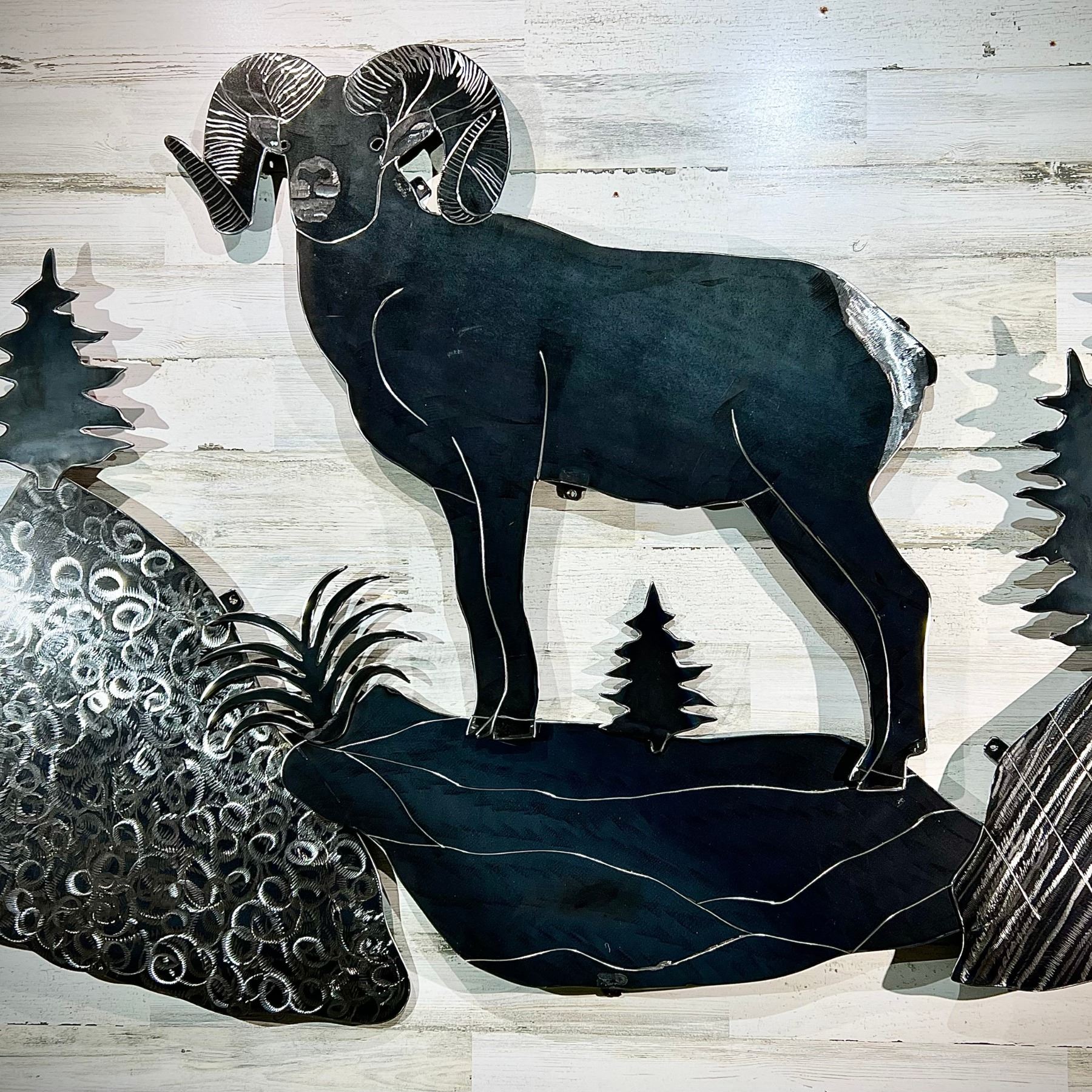 It features a textured and polished metal bighorn sheep standing atop a rocky outcropping.