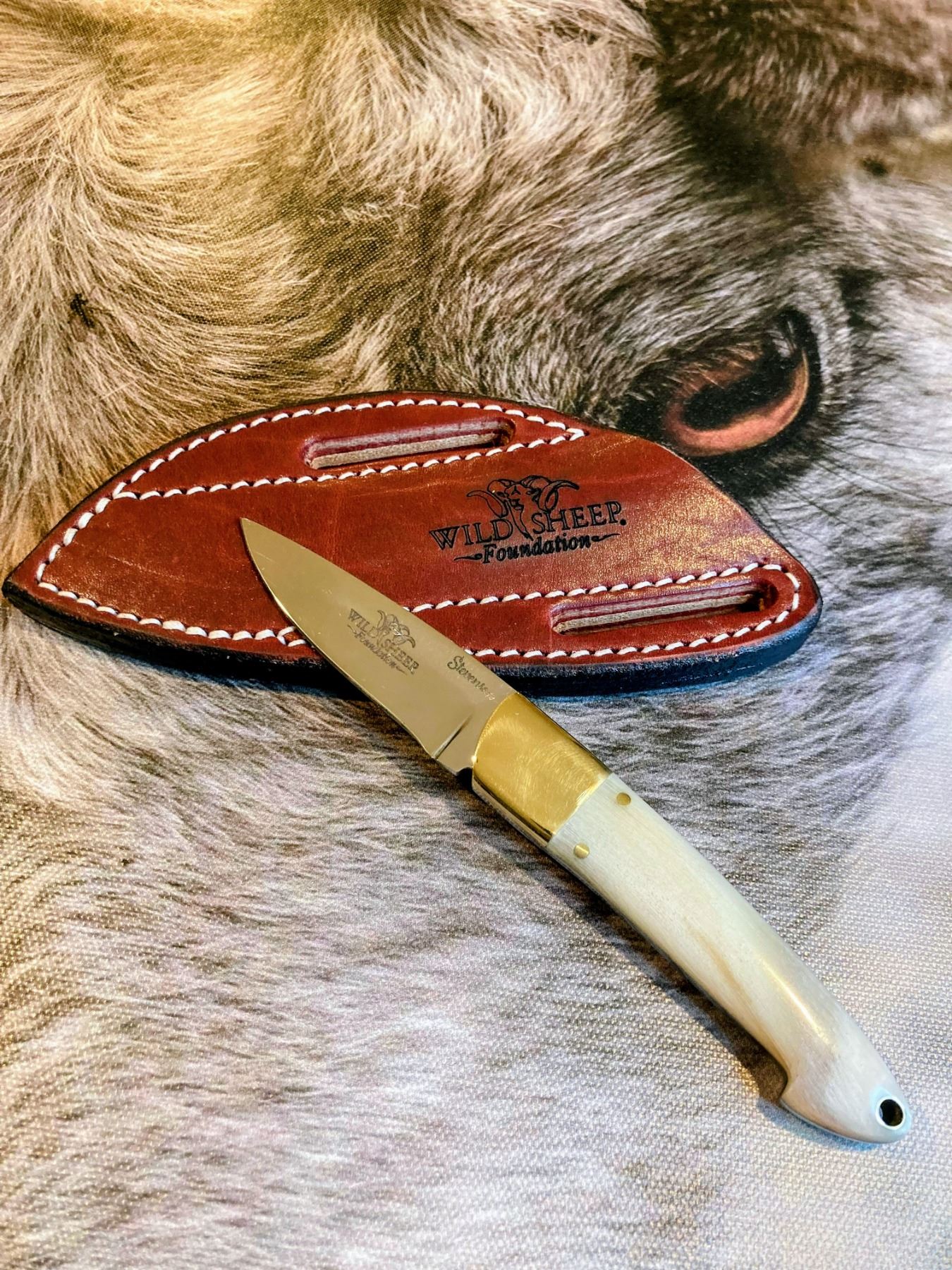 This is a custom RWL "Gentlemen’s'" blade carry knife with brass bolsters and sheep horn handle. Comes with a custom sheath with WSL logo and logo is also on the blade. (100% Fully Donated)