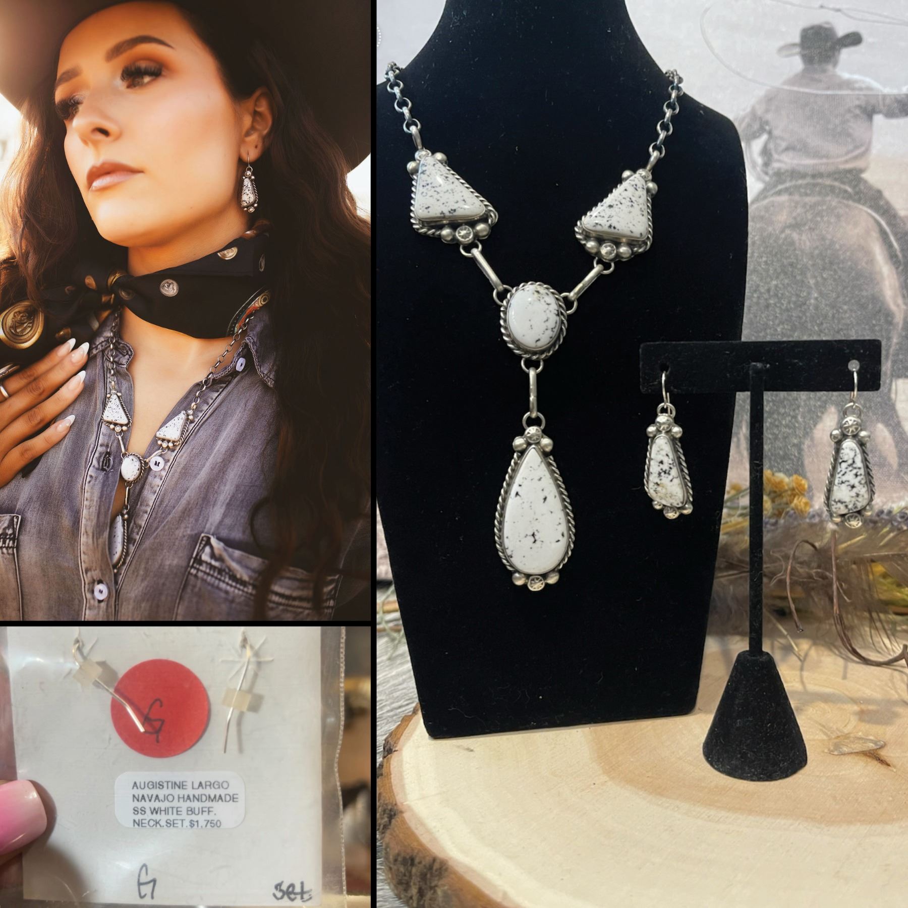 This exquisite set, featuring a matching necklace and earrings, is handcrafted from sterling silver and genuine White Buffalo turquoise.
