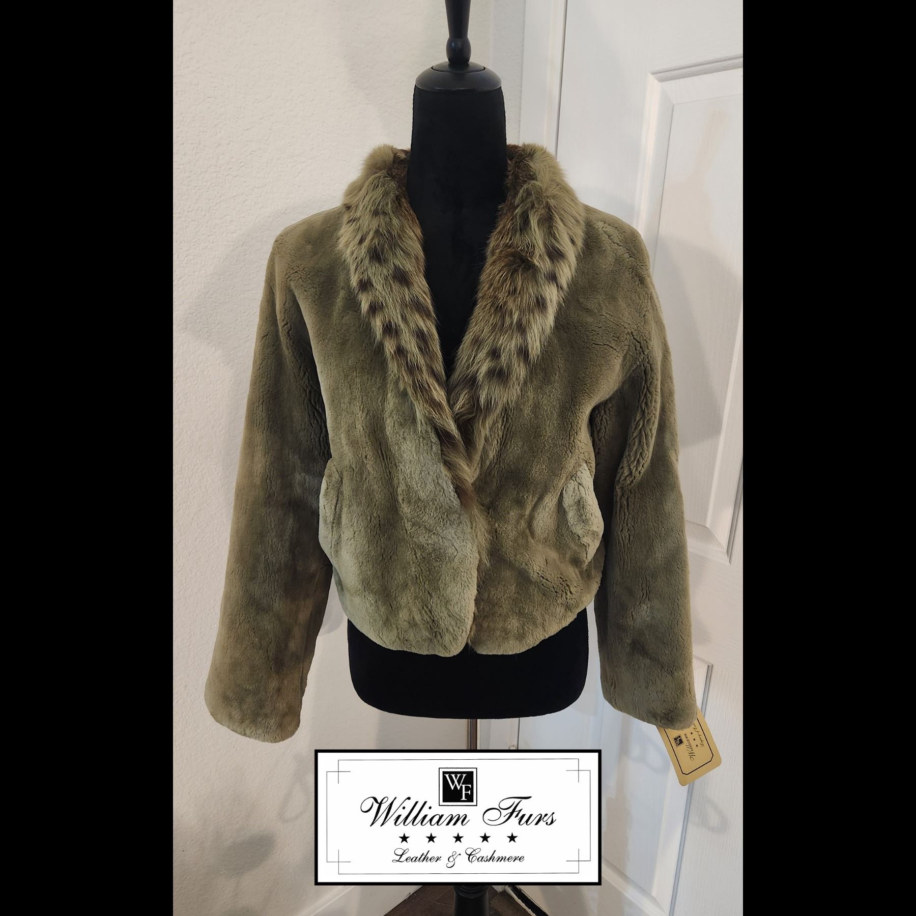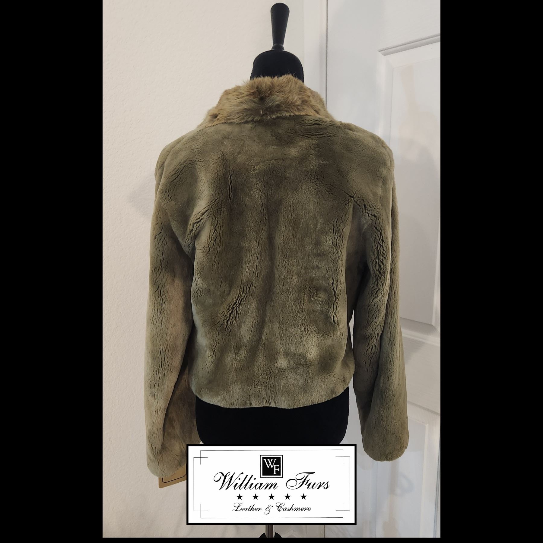 This is a beautiful green sheared beaver jacket with spotted rabbit collar.