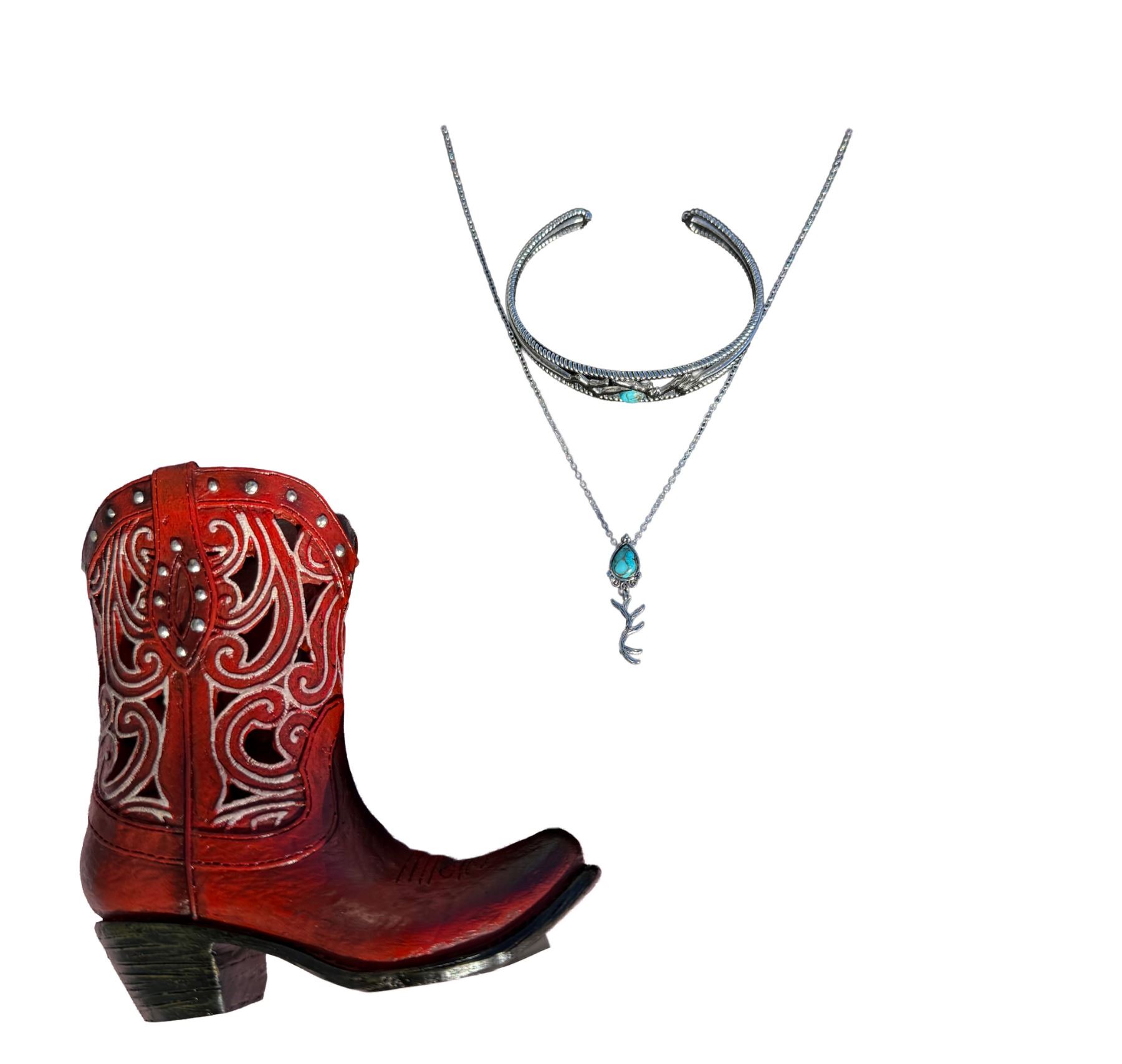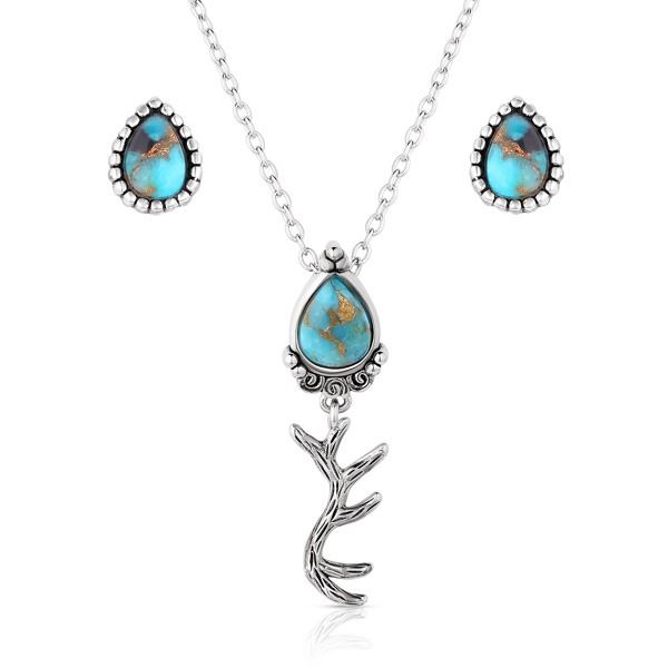 Find the beauty of nature with the Highland Beauty Turquoise Jewelry Set. The earrings feature a tear drop shaped turquoise stone. A beaded silver border completes the design of the post earrings. The necklace has a tear drop shaped stone. A silver elk antler hangs from the bottom of the pendant, creating a unique design. The antlers have life like carvings and weathering, creating a realistic look. Stone color may vary.