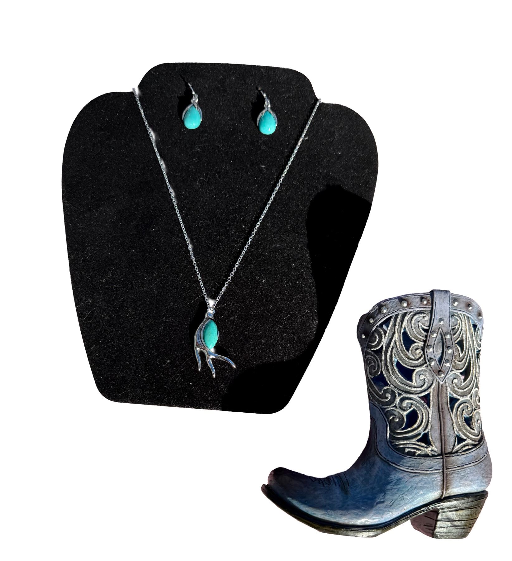 Find the beauty of nature with the Highland Beauty Turquoise Jewelry Set. The earrings feature a tear drop shaped turquoise stone. A beaded silver border completes the design of the post earrings. The necklace has a tear drop shaped stone. A silver elk antler hangs from the bottom of the pendant, creating a unique design. The antlers have life like carvings and weathering, creating a realistic look. Stone color may vary. Includes a matching bracelet