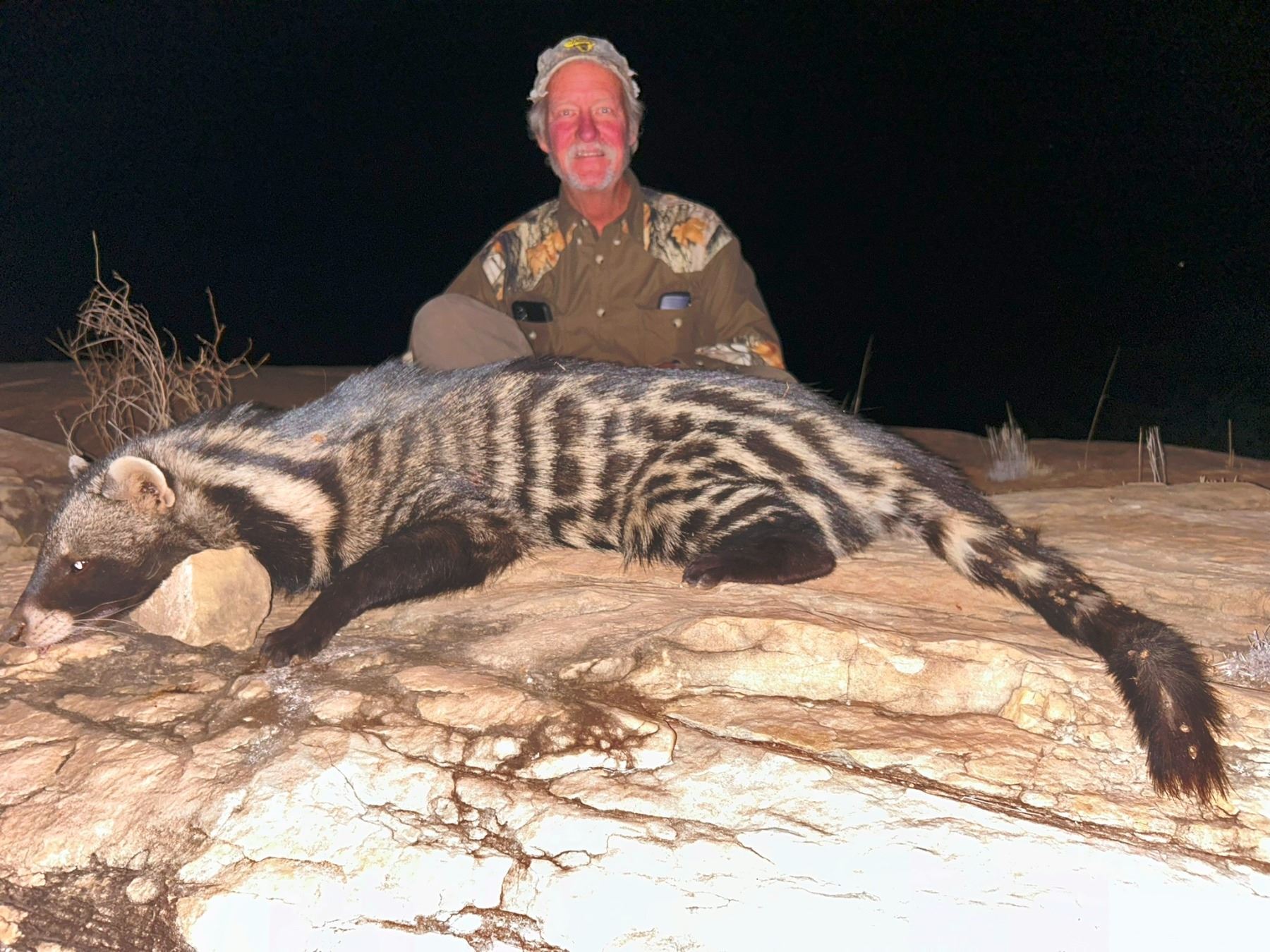 Thaba Mmoyo Safaris proudly invites one hunter and one non-hunter to experience a 7-day/8-night 1x1 small predator safari at their exceptional safari destination in South Africa - includes trophy fees for African wild cat, civet, genet cat and honey badger. Method of take is rifle in .22 Hornet or .22 Mag. This hunt is available July-November 2026 or 2027 and may be upgraded to include any of the diverse species found on this family-owned ranch and free-range concession. Additional hunters are welcome at $450/day; non-hunters are welcome at $195/day. Transportation during the hunt is mostly by safari vehicle. This package includes field prep, transportation to shipper, RT transfers from Polokwane International Airport, luxury thatched-roof chalet accommodations, maid/laundry service, Wi-Fi, non-alcoholic beverages, full bar and all meals. Not included are dip & pack service, accommodations before/after the hunt in Johannesburg at approx. $120/night (if needed) and gratuities. DSC references include David Nasky, Dewey Dalton and Tommy Bridgers. DALLAS SAFARI CLUB THANKS THABA MMOYO SAFARIS FOR THIS 100% DONATION. Fanie Steyn, 011 27 15 065 0350, 011 27 83 228 0404, fanieasj@gmail.com; info@thabammoyo.co.za, www.ThabaMmoyo.Co.Za, BOOTH #2617.
