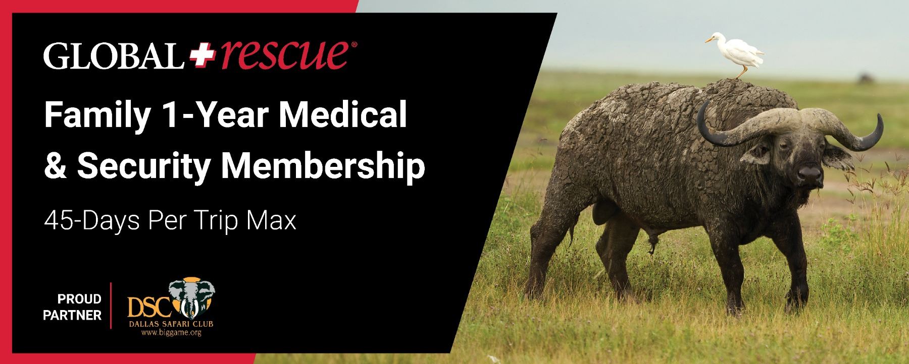 Global Rescue One-Year Family Membership - Medical & Security included - 45-day per trip maximum. This certificate must be redeemed by 12/31/2026. The winning bidder may use the value of this certificate as a credit toward an upgrade of a single membership, such as extending to a multi-year or adding high-altitude coverage. The value cannot be shared across multiple memberships and must be used towards a single membership. If you are between the ages of 75 and 84 you may also apply the value toward an Extended Plan membership, however approval is dependent on the completion and approval of an Extended Plan application. This membership is not valid for polar travel. For more information and redeem your certificate, contact Global Rescue members services at +1 (617) 459-4200 or memberservices@globalrescue.com. DALLAS SAFARI CLUB THANKS GLOBAL RESCUE FOR THIS 100% DONATION. Samantha Hosking, 617-459-4200, shosking@globalrescue.com, www.GlobalRescue.Com, BOOTH #1533.