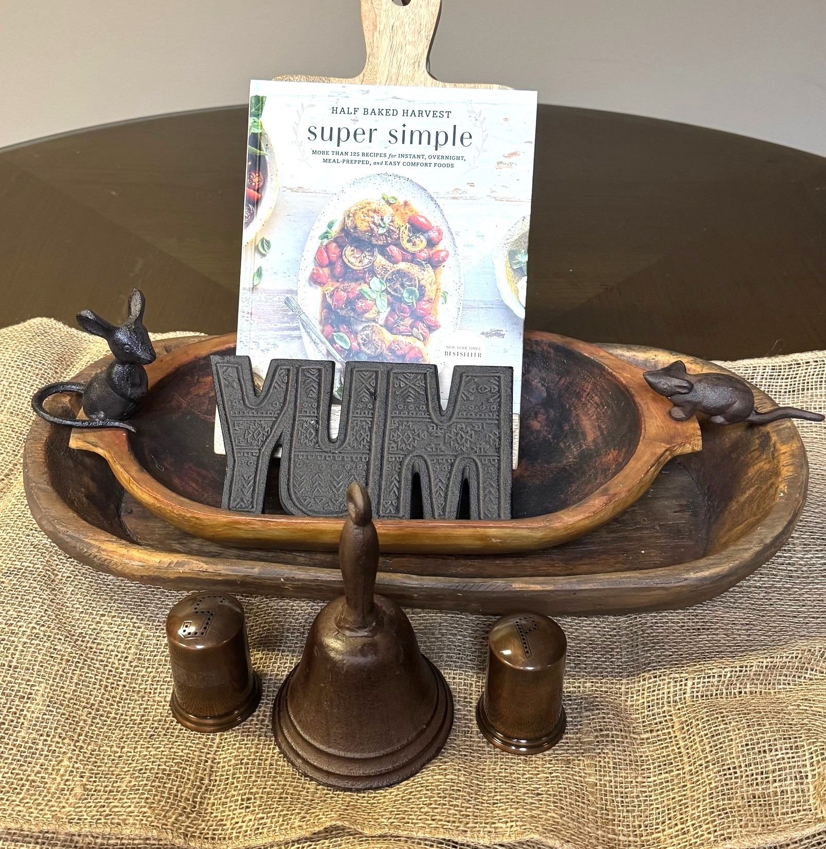 "When The Chef's Away" kitchen collection includes a cutting board cookbook stand, Half Baked Harvest cookbook, bronze dinner bell, YUM iron trivet, copper salt & pepper shakers, 2x handcrafted solid wood dough bowls and 2x cute little caste iron mice having a Ratatouille moment while the chef's away. DALLAS SAFARI CLUB THANKS FRIEND OF DSC FOR THIS 100% DONATION. Christie Selle, christie@biggame.org.