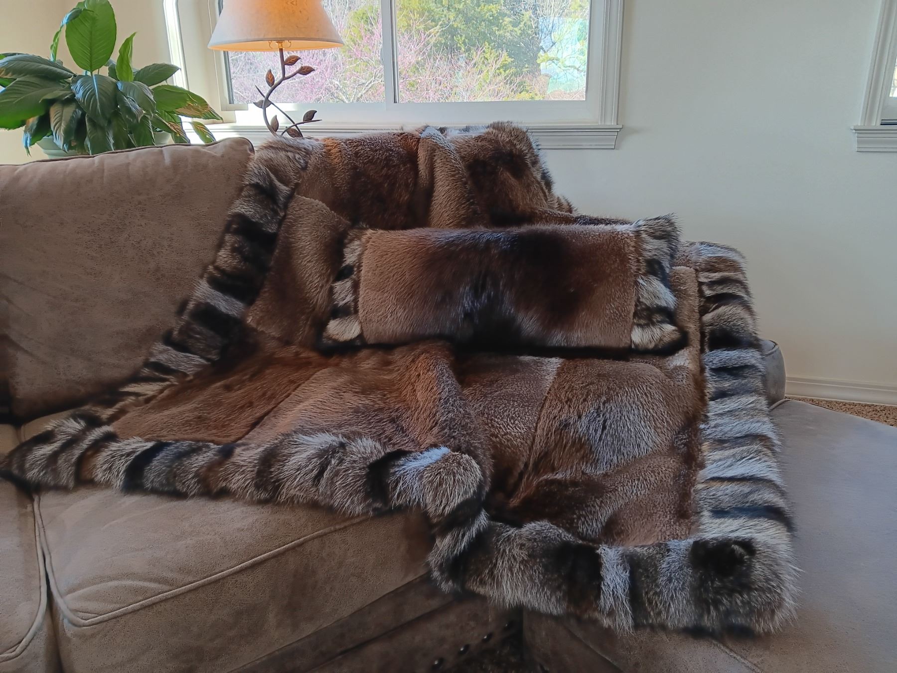 Uniquely designed natural beaver fur blanket with raccoon fringe trim and quilted cotton velvet backing; measures 50"Wx60"L. Also includes a matching beaver bolster pillow with raccoon fringe trim measuring 30"Wx14"L. Two beautiful home accents you won't want to live without! Kim Taylor, 479-754-5592, kimtaylor@msn.com.