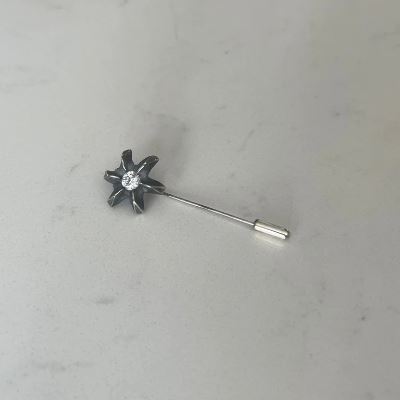Finished with a 6mm clear quartz crystal, this versatile pin makes a subtle yet commanding impression.